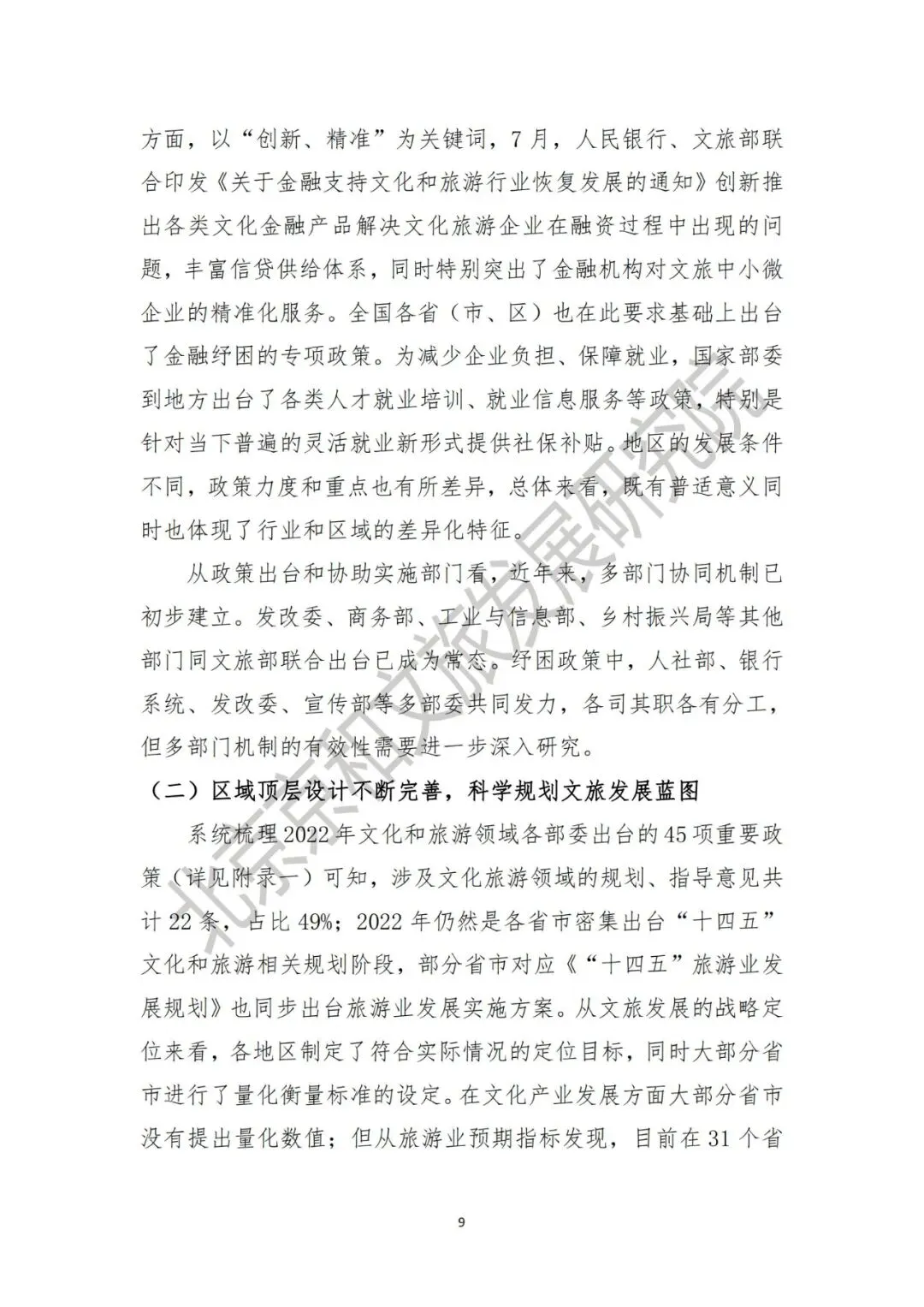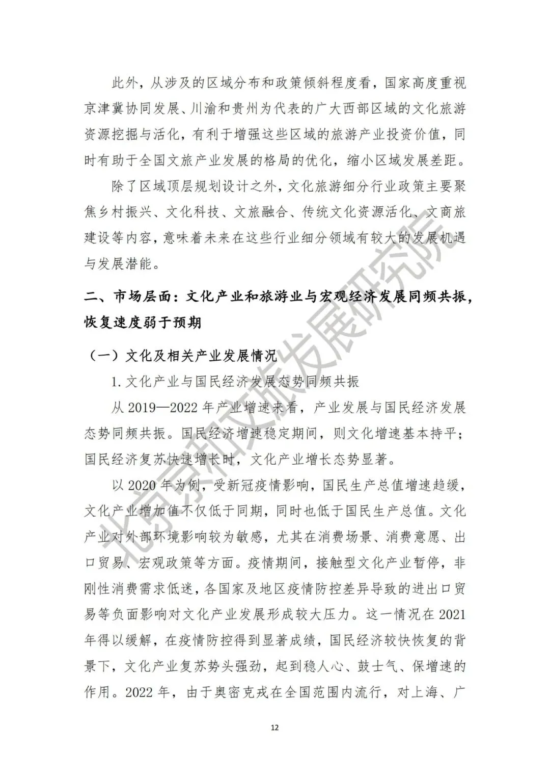 第一,文旅纾困组合拳政策推动行业复苏回暖。在疫情持续影响之下,以《关于促进服务业领域困难行业恢复发展的若干政策》《关于扩大阶段性缓缴社会保险费政策实施范围等问题的通知》《关于金融支持文化和旅游行业恢复发展的通知》为代表的文旅行业纾困组合拳政策落地,从税收、金融、就业等多个层面发力,提振文旅市场复苏回信心。从政策出台和协助实施部门看,近年来,文化和旅游部与人社部、发改委、商务部、工业与信息部、乡村振兴局等其他部门联合出台文旅领域相关政策成为常态,但多部门牵头下的政策落地有效性还需进一步深入研究。第二,区域顶层设计不断完善,科学规划文旅发展蓝图。2022年,文化和旅游领域各部委出台的45项重要政策中(详见附录一),规划、指导意见类文本共计22条,占比达49%。2022年仍然是各省市“十四五”文化和旅游相关规划及实施方案密集出台的年份。从文旅发展的战略定位来看,各地区制定了符合实际情况的定位目标,同时大部分省市进行了量化衡量标准的设定。从区域看,国家高度重视京津冀协调发展区、以川渝和贵州为代表的西部区域的文化产业发展。此外,文化旅游细分行业政策主要聚焦乡村振兴、文化科技、文旅融合、传统文化资源活化、文商旅建设等领域,未来这些行业细分领域或有较大的发展潜能。二、市场层面:文化产业和旅游业与宏观经济发展同频共振,恢复速度弱于预期