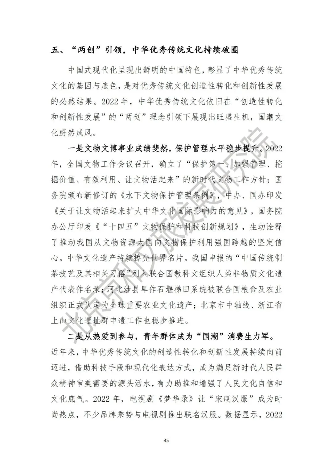一是文化产品“出海”亮点频现,网文、游戏、影视剧表现抢眼。近年来我国文化产品进出口连续保持顺差。尽管受到疫情的影响,2021年中国对外文化贸易额首次突破了2000亿美元,同比增长38.7%[10]。2022年,网络文学、古装影视剧持续引燃海外市场。二是平台基地建设提质增效。在上海、北京、深圳3家国家对外文化贸易基地稳步发展的基础上,新一批国家对外文化贸易基地申报工作已经启动;以中国(深圳)国际文化产业博览交易会、中国(武汉)文化旅游博览会为代表的文化产业和旅游产业博览会平台功能不断凸显。三是海外文旅推广工作有序开展。“中国旅游文化周”“大运河主题旅游海外推广季”“多彩中国 佳节好物”等文化和旅游贸易促进系列活动有序开展。一是文物文博事业成绩斐然,保护管理水平稳步提升。2022年,全国文物工作会议召开,确立了“保护第一、加强管理、挖掘价值、有效利用、让文物活起来”的新时代文物工作方针;遗产保护方面,中华文化持续擦亮世界名片。“中国传统制茶技艺及其相关习俗”列入联合国教科文组织人类非物质文化遗产代表作名录;河北涉县旱作石堰梯田系统被联合国粮食及农业组织正式认定为全球重要农业文化遗产。二是青年群体成为“国潮”消费生力军。2022年,《中国考古大会》《古韵新声》《典籍里的中国》第二季、《诗画中国》《2023元宵奇妙游》等节目热播,文化类节目持续“破圈”流行。在国风元素与消费行业深度链接的背景下,青年群体同样展现出了极大的消费热情和强劲的消费能力。六、“深度融合”,指明文旅发展目标方向
