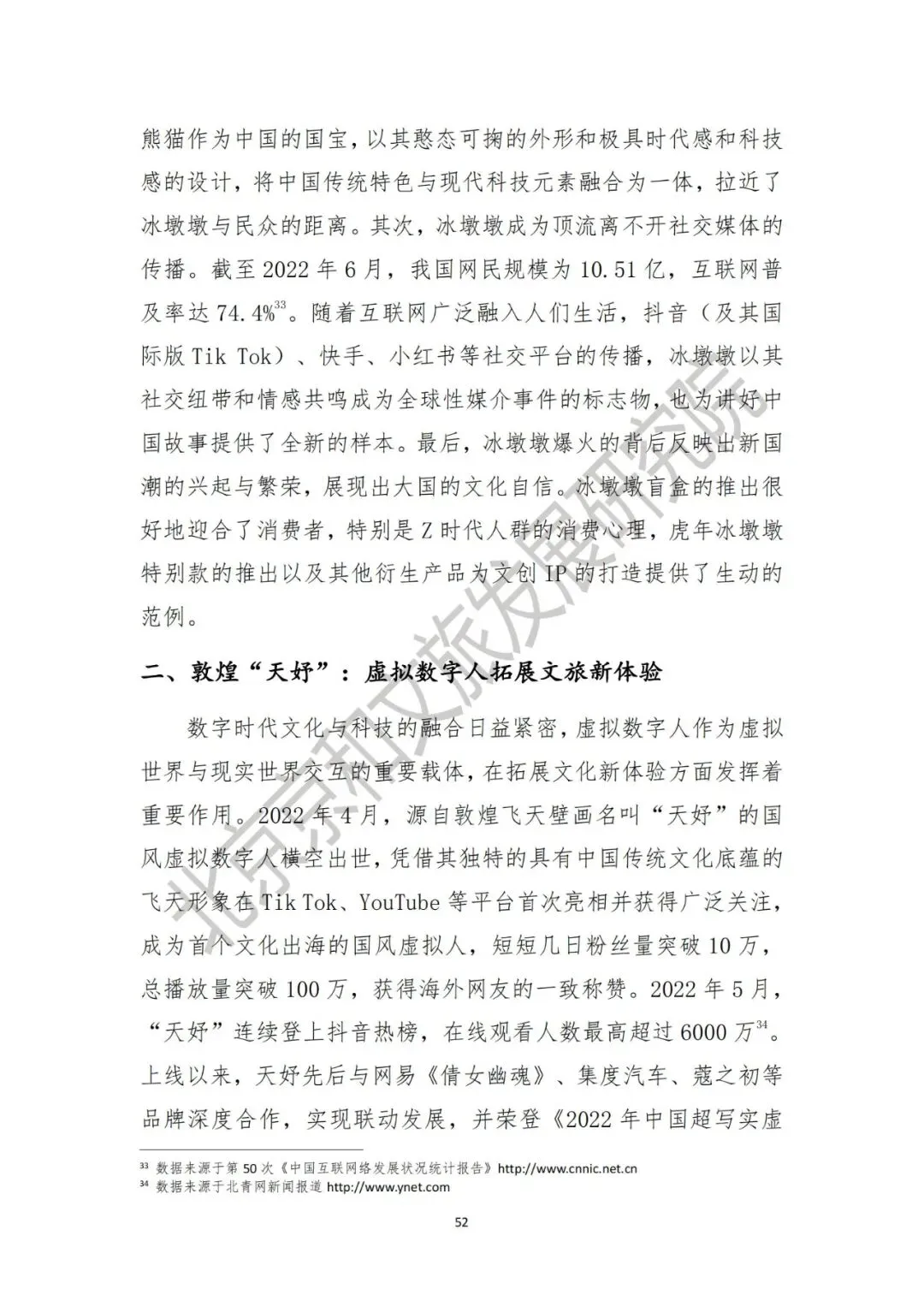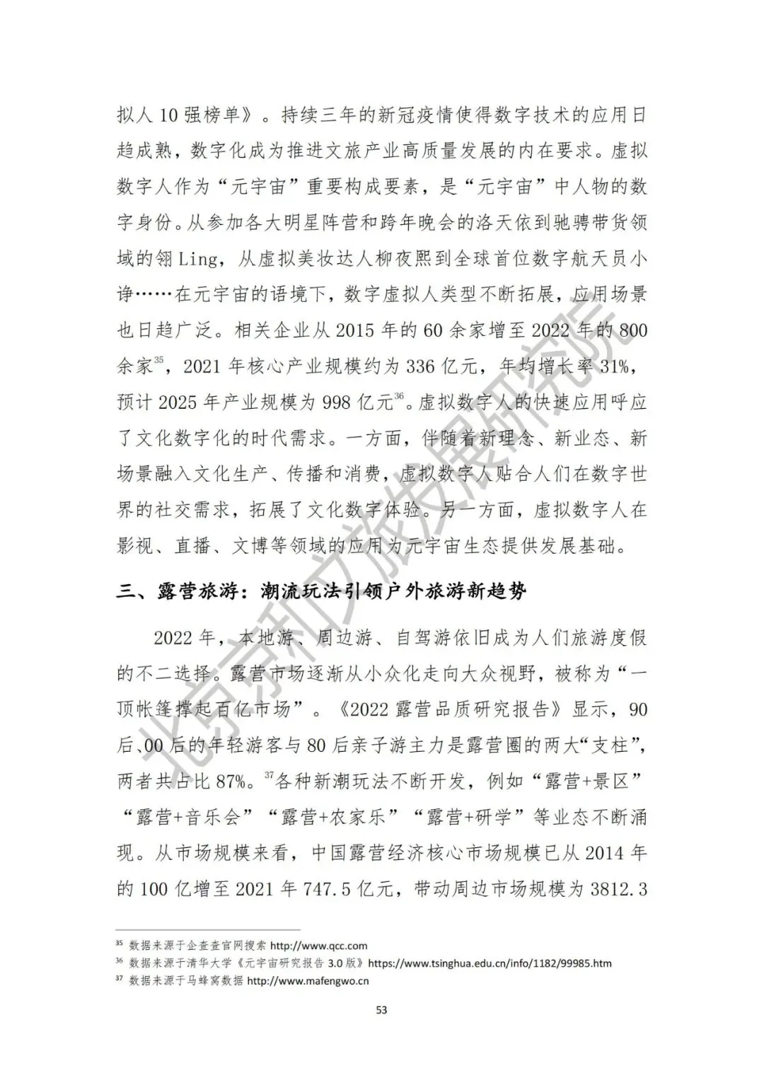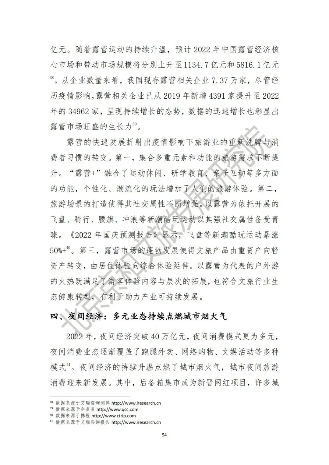《报告》中也提出了2022 年文化产业和旅游业年度八大热点事件,分别是:一、冬奥冰墩墩:国潮走向世界的文化顶流 IP。2022 年北京冬奥会开幕掀起冰雪热潮,吉祥物冰墩墩实力出圈成为顶流。抢购热潮带来的“一墩难求”现象使得冰墩墩成为年度热点文创 IP;二、敦煌 “ 天妤 ”:虚拟数字人拓展文旅新体验。2022 年 4 月,一个源自敦煌飞天壁画名叫“天妤”的国风虚拟数字人横空出世,凭借其独特的具有中国传统文化底蕴的飞天形象获得海外关注,成为首个文化出海的国风虚拟人;三、露营旅游:潮流玩法引领户外旅游新趋势。本地游、周边游、自驾游依旧成为人们旅游度假的不二选择精致露营迅速崛起,不断探索新玩法。露营市场历三年疫情逐渐从小众化走向大众视野,被称为“一顶帐篷撑起百亿市场”;四、夜间经济:多元业态持续点燃城市烟火气。2022 年,夜间经济突破 40 万亿元,夜间消费模式更为多元。夜间经济的持续升温点燃了城市烟火气,城市夜间旅游消费迎来新发展;五、国潮出圈:文创消费让文物 “ 活 ” 起来。2022 年,国潮显露出旺盛的生命力,博物馆文创持续出圈,传统文化创新发展取得新成果。新形象、新品牌、新 IP,让中国传统文化在当今时代焕发出勃勃生机;六、数字藏品:文化科技激发数字文旅新潜力。从最初文创数字藏品的数秒售罄到文博行业的 IP 授权,再到数字音乐版权的探索,数字藏品颠覆了人们传统收藏形式,每款产品限量发行在延续收藏价值的同时也成为独一无二的资产;七、中国茶技艺:申遗助推非遗保护传承创新。茶文化背后所蕴含的是人与自然和谐共生的理念以及中华民族的精神特质。此次中国茶申遗成功更加引起公众关注,对于传统文化保护传承具有重要意义;八、文旅新业态:政策规范市场主体健康成长。相关文件的相继出台抑制了部分新业态的“野蛮生长”。同时,面对互联网文娱出现的各种乱象,2022 年“清朗”系列专项行动聚焦典型问题开展整治。通过系列政策陆续出台,也为互联网健康发展提供了政策保障。