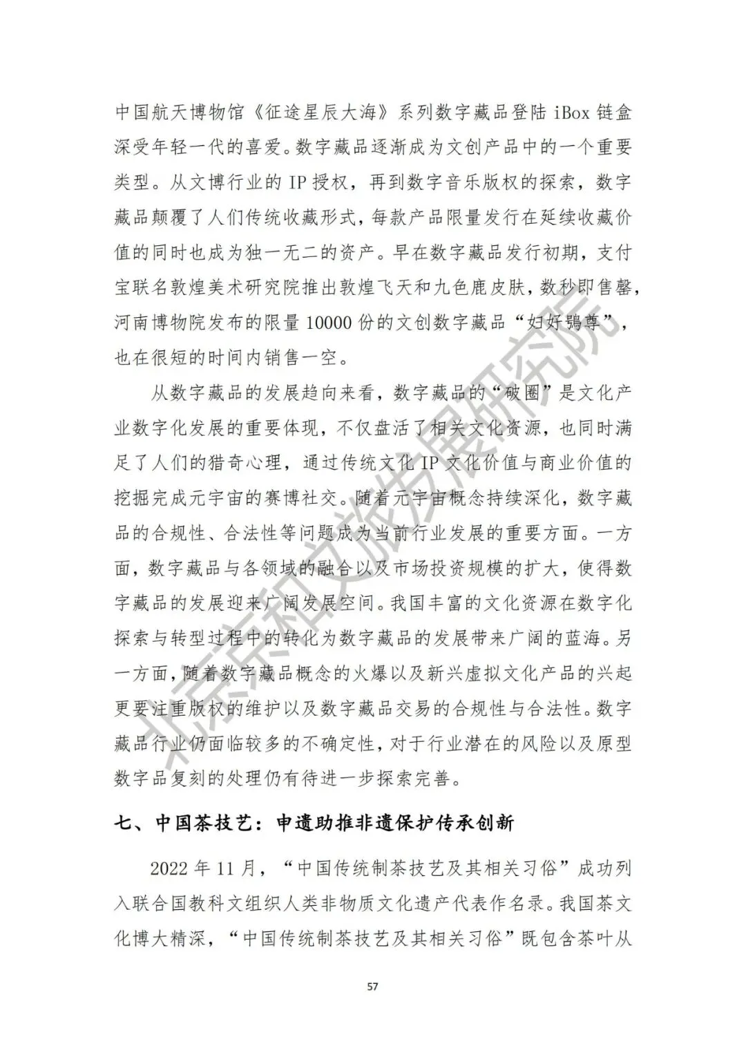 2022年4月,在中国航天日到来之际,全球首个“月壤”数字藏品重磅亮相。消息一经推出便在航天爱好者和数字藏品圈中引起极大轰动,太空兔、祝融号和太空奇遇上线后火速售罄。2022年11月,中国航天CNSA组合徽章”数字藏品碎片盲盒重磅推出,中国航天博物馆《征途星辰大海》系列数字藏品登陆iBox链盒深受年轻一代的喜爱。数字藏品的推出使得社会对航天事业的关注度显著提升,藏品背后展现出中国航天事业60多年来的筚路蓝缕,展现出一代代航天人的接续努力。从最初文创数字藏品的数秒售罄到文博行业的IP授权,再到数字音乐版权的探索,数字藏品颠覆了人们传统收藏形式,每款产品限量发行在延续收藏价值的同时也成为独一无二的资产。七、中国茶技艺:申遗助推非遗保护传承创新