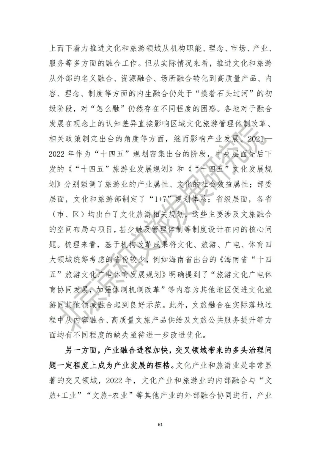 第一,文化旅游融合过程“融而不合”等问题仍然突出。自2018年文化和旅游部组建以来,全国各地以“以文塑旅、以旅彰文、宜融则融、能融尽融”为总体思路自上而下着力推进文化和旅游领域从机构职能、理念、市场、产业、服务等多方面的融合工作。但从实际情况来看,推进文化和旅游从外部的概念融合、资源融合、场所融合转化到高质量产品、内容、理念、制度等方面的内生融合仍处于“摸着石头过河”的初级阶段,对“怎么融”仍然存在不同程度的困惑,突出体现在各地对于融合发展在观念上的认知差异直接影响区域文化旅游管理体制改革、相关政策制定出台的角度等实际管理等方面,继而影响产业发展。第二,产业融合进程加快,交叉领域带来的多头治理问题一定程度上成为产业发展的桎梏。2022年,文化产业和旅游业的内部融合与“文旅+工业”“文旅+农业”等其他产业的外部融合协同进行,产业融合带来的多头治理、权责不清的问题较为突出。从梳理的2022年文化旅游领域45项主要政策(详见附录一)来看,两个以上部门联合发布的政策超过18项,超过5个部门联合发布政策超过14项,各部门在实际工作过程中的权责分配尚不清晰。同时,多部门在治理过程中功能垂直,互相之间没有联系,直接影响了文化和旅游企业的实际经营。伴随着文化旅游领域新业态、新模式不断涌现,产业发展呼唤新兴治理手段,通过理顺多头管理体系进一步释放市场主体活力,促进文化大发展大繁荣。