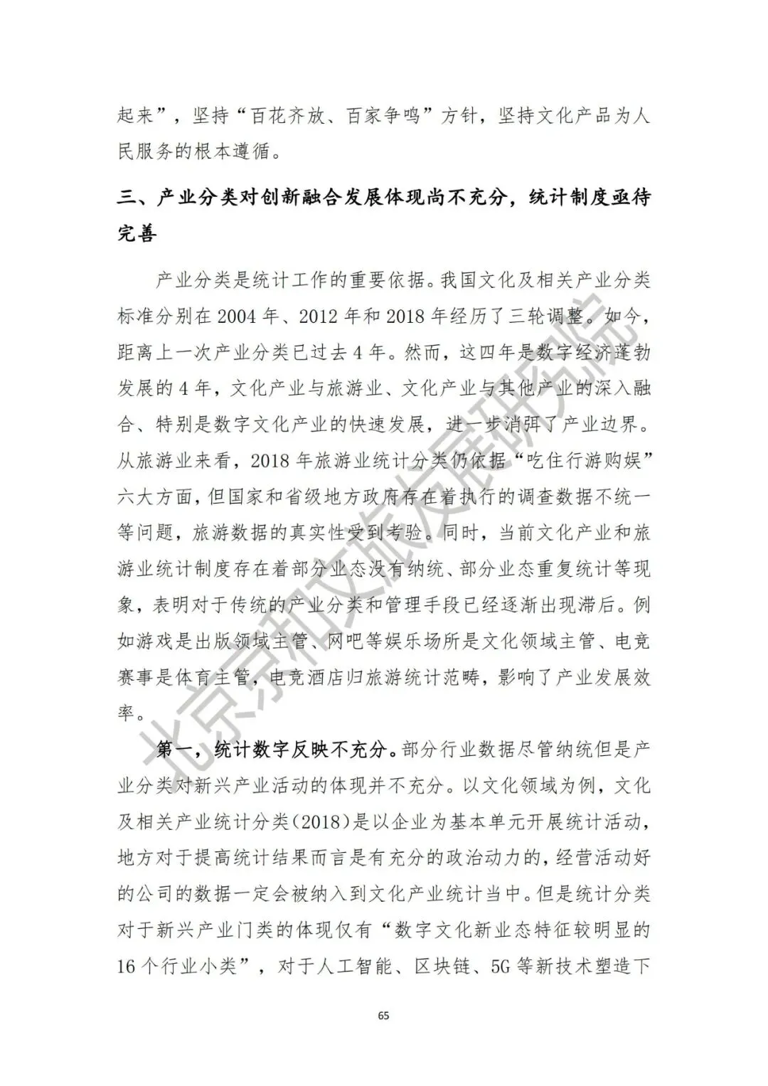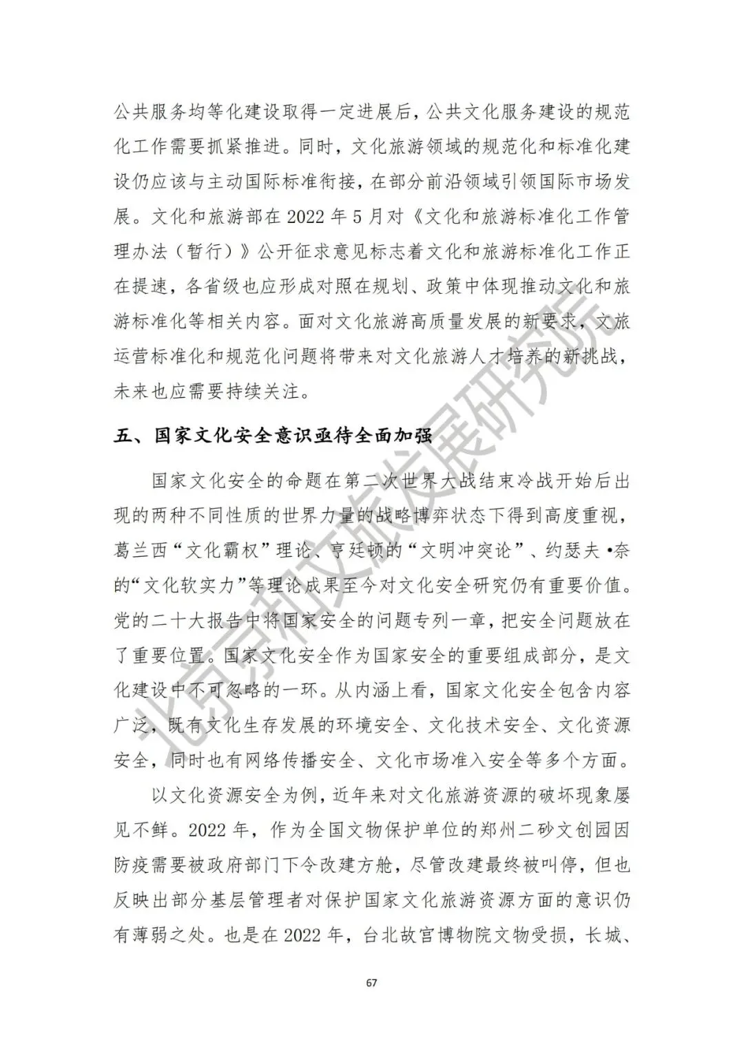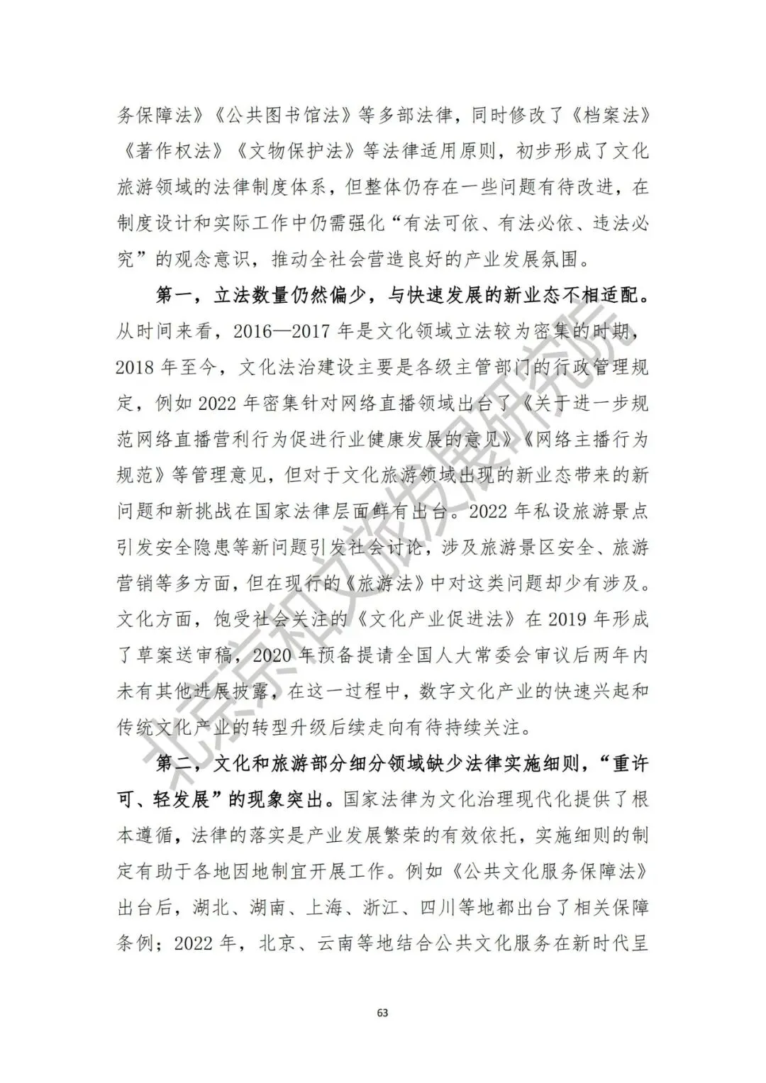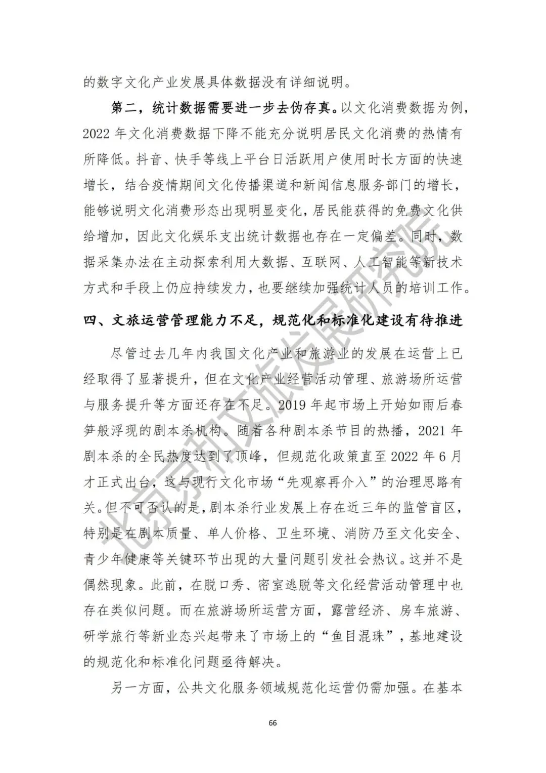 第一,立法数量仍然偏少,与快速发展的新业态不相适配。从时间来看,2016—2017年是文化领域立法较为密集的时期,2018年至今,文化法治建设主要是各级主管部门的行政管理规定。2022年私设旅游景点引发安全隐患等新问题引发社会讨论,涉及旅游景区安全、旅游营销等多方面,但在现行的《旅游法》中对这类问题却少有涉及。文化方面,饱受社会关注的《文化产业促进法》在2019年形成了草案送审稿,2020年预备提请全国人大常委会审议后两年内未有其他进展披露。第二,文化和旅游部分细分领域缺少法律实施细则,“重许可、轻发展”的现象突出。例如《电影产业促进法》颁布已有六年但至今仍然缺少实施细则,尽管法律文本中在电影审查、发放许可等方面均明确权责并制定了奖惩措施。但从现实执行情况来看,电影审查的具体标准和程序仍不透明,部分电影在获得电影公映许可证上映后仍然面临着“下映”风险。第三,文化治理“收口”与文化生产开放创新之间的平衡关系还需厘清。党的二十大报告指出“要牢牢掌握党对意识形态工作的领导权、全面落实意识形态工作责任制”,这是基于历史经验、理论总结、实际国情和未来发展需要所作出的正确判断。但文化与意识形态紧密相连但并不等同于完全意识形态。文化产品的社会效益优先也不等于政治效益优先。因此,文化治理既要让文化产业的水“清起来”,也要让文化产业的水“活起来”。三、产业分类对创新融合发展体现尚不充分,统计制度亟待完善第一,统计数字反映不充分。部分行业数据尽管纳统但是产业分类对新兴产业活动的体现并不充分。以文化领域为例,文化及相关产业统计分类(2018)是以企业为基本单元开展统计活动,地方对于提高统计结果而言是有充分的政治动力的,经营活动好的公司的数据一定会被纳入到文化产业统计当中。但是统计分类对于新兴产业门类的体现仅有“数字文化新业态特征较明显的16个行业小类”,对于人工智能、区块链、5G等新技术塑造下的数字文化产业发展具体是多少没能详细说明。第二,统计数据具有一定的欺骗性,需要进一步去伪存真。以文化消费数据为例,2022年文化消费数据下降不能充分说明居民文化消费的热情有所降低。抖音、快手等线上平台日活用户使用时长方面的快速增长,结合疫情期间文化传播渠道和新闻信息服务部门的增长,能够说明文化消费形态出现明显变化,居民能获得的免费文化供给增加,因此文化娱乐支出统计数据也存在一定偏差。同时,数据采集办法在主动探索利用大数据、互联网、人工智能等新技术方式和手段上仍应持续发力,也要继续加强统计人员的培训工作。四、文旅运营管理能力不足,规范化和标准化建设有待推进第一,文化产业经营活动管理、旅游场所运营与服务提升等方面还存在不足。2019年起市场上开始如雨后春笋般浮现的剧本杀机构。但规范化政策直至2022年6月才正式出台,这与现行文化市场“先观察再介入”的治理思路有关。但不可否认的是,剧本杀行业发展上存在近三年的监管盲区,特别是在剧本质量、单人价格、卫生环境、消防乃至文化安全、青少年健康等关键环节出现的大量问题引发社会热议。这并不是偶然现象。此前,在脱口秀、密室逃脱等文化经营活动管理中也存在类似问题。而在旅游场所运营方面,露营经济、房车旅游、研学旅行等新业态兴起带来了市场上的“鱼目混珠”,基地建设的规范化和标准化问题亟待解决。第二,公共文化服务领域规范化运营仍需加强。在基本公共服务均等化建设取得一定进展后,公共文化服务建设的规范化工作也要抓紧推进。同时,文化旅游领域的规范化和标准化建设仍应该与主动国际标准衔接,在部分前沿领域引领国际市场发展。文化和旅游部在2022年5月对《文化和旅游标准化工作管理办法(暂行)》公开征求意见标志着文化和旅游标准化工作正在提速,各省级也应形成对照在规划、政策中体现推动文化和旅游标准化等相关内容。面对文化旅游高质量发展的新要求,文旅运营标准化和规范化问题将带来对文化旅游人才培养的新挑战,未来也应需要持续关注。党的二十大报告中将国家安全的问题专列一章,把安全问题放在了重要位置。国家文化安全作为国家安全的重要组成部分,是文化建设中不可忽略的一环。从内涵上看,国家文化安全包含内容广泛,既有文化生存发展的环境安全、文化技术安全、文化资源安全,同时也有网络传播安全、文化市场准入安全等多个方面。以文化资源安全为例,近年来对文化旅游资源的破坏现象屡见不鲜的。2022年,作为全国文物保护单位的郑州二砂文创园因防疫需要被政府部门下令改建方舱,尽管改建最终被叫停,但反映出部分基层管理者对保护国家文化旅游资源方面的意识淡薄。再以网络传播安全为例,网络传播安全既包含着意识形态为核心的政治文化安全,同时也包含着本民族文化安全和大众娱乐文化安全,前者的作用在于继承优秀传统文化,后者的作用在于传播健康内容,塑造社会文明。2021—2022年,文化和旅游部、国家广电总局、网信办等多部门连续发起网络空间“清朗行动”,短期内成果显著,但从长期来看,仍然需要依靠政府依法管理,企业、公民自觉等多个途径共同维护。维护文化安全不仅是管理部门的职责所在,也是社会