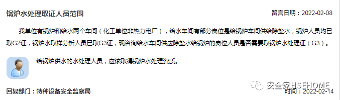 咨询:我单位有锅炉和给水两个车间(化工单位非热力电厂),给水车间有部分岗位是给锅炉车间供给除盐水,锅炉人员均已取G2证,锅炉水取样分析人员已取G3证,现咨询给水车间供应除盐水给锅炉的岗位人员是否需要取锅炉水处理证(G3)。