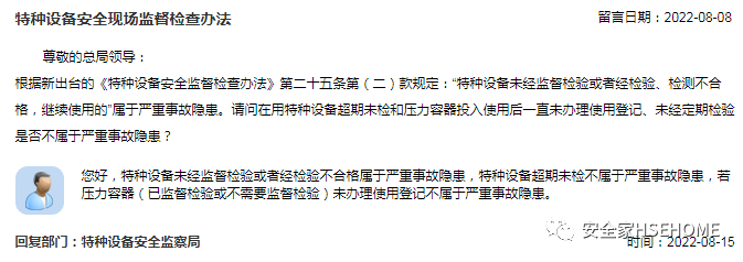 咨询:根据新出台的《特种设备安全监督检查办法》第二十五条第(二)款规定:“特种设备未经监督检验或者经检验、检测不合格,继续使用的”属于严重事故隐患。请问在用特种设备超期未检和压力容器投入使用后一直未办理使用登记、未经定期检验是否不属于严重事故隐患?