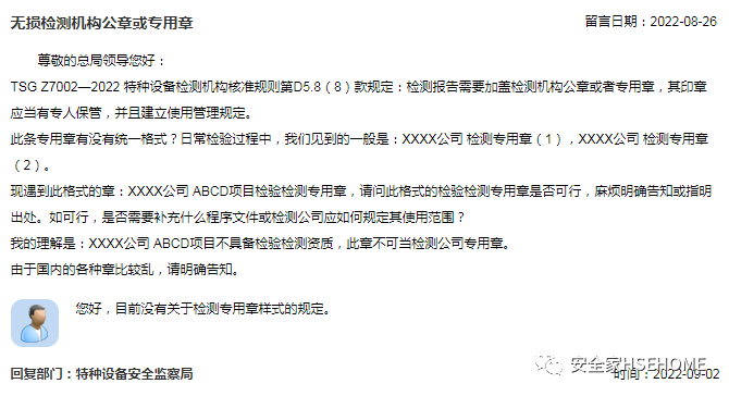 咨询:TSG Z7002—2022 特种设备检测机构核准规则第D5.8(8)款规定:检测报告需要加盖检测机构公章或者专用章,其印章应当有专人保管,并且建立使用管理规定。此条专用章有没有统一格式?日常检验过程中,我们见到的一般是:XXXX公司 检测专用章(1),XXXX公司 检测专用章(2)。