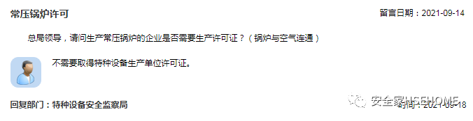 咨询:总局领导,请问生产常压锅炉的企业是否需要生产许可证?(锅炉与空气连通)