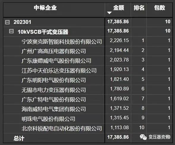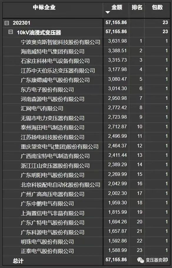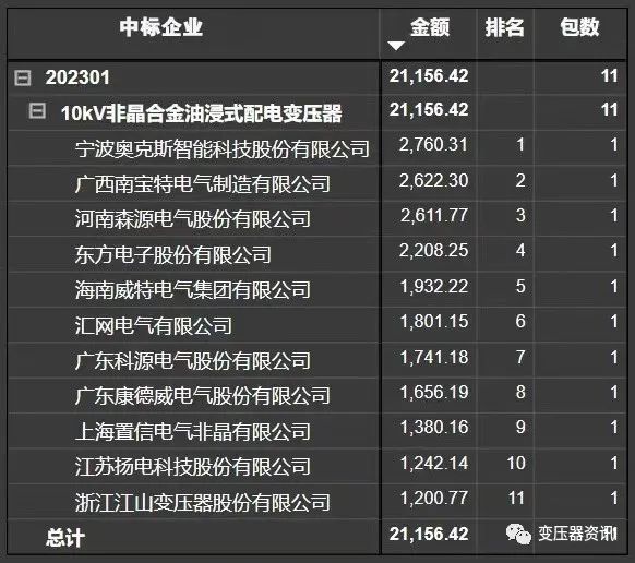 南方电网公司2023年配网设备第一批框架招标项目(招标编号:CG2700022001580324),确定中标人已经公布,其中10kV油浸式变压器、10kV非晶合金配电变压器、10kV干式变压器中标企业排名如下: