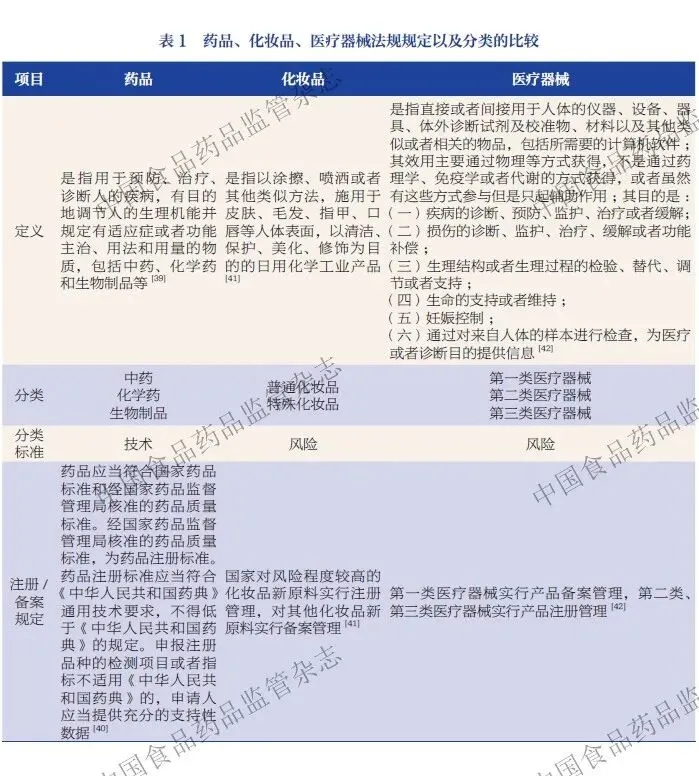 我国法规对于药品、化妆品、医疗器械等产品有着明确的定义和区分,这是监管和维护行业秩序、保障人民群众生命健康的必要手段(表1)。笔者提出的“新概念护肤产品”,并不是一个监管层面上的概念,而是从认识论的角度对化妆品多重创新趋势下催生出的新产品的梳理和概括。这些产品都在概念上挑战着人们对化妆品的传统认知,是对固有概念边界的外延。它们的出现是一种客观、自然的发展,其可能无法规避,也不应该全盘否认其存在的合理性,而应当理性看待,正视并重视其给市场和监管带来的潜在挑战。正确识别这些挑战,有利于相关部门调整策略,更好地维护市场秩序,为消费者的权益与生命健康保驾护航。
