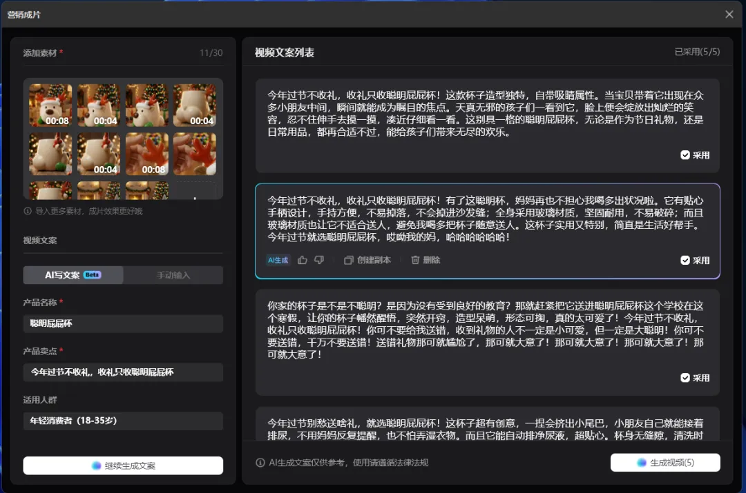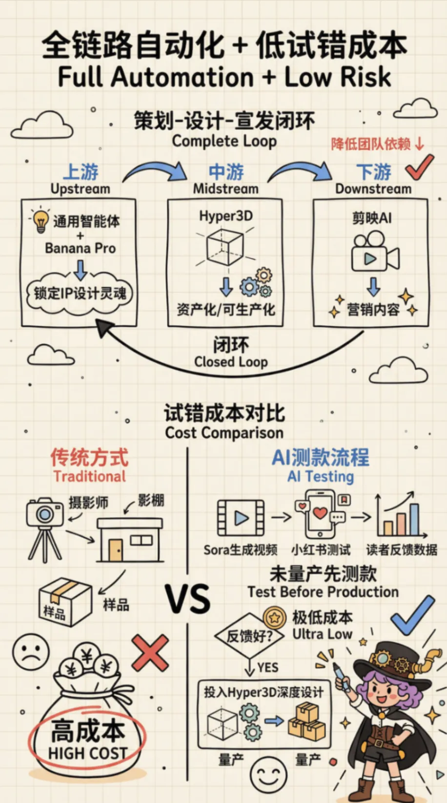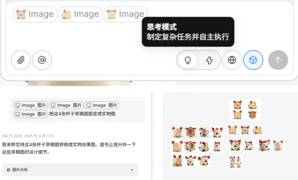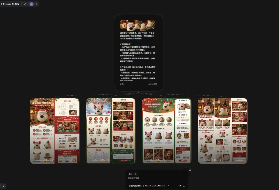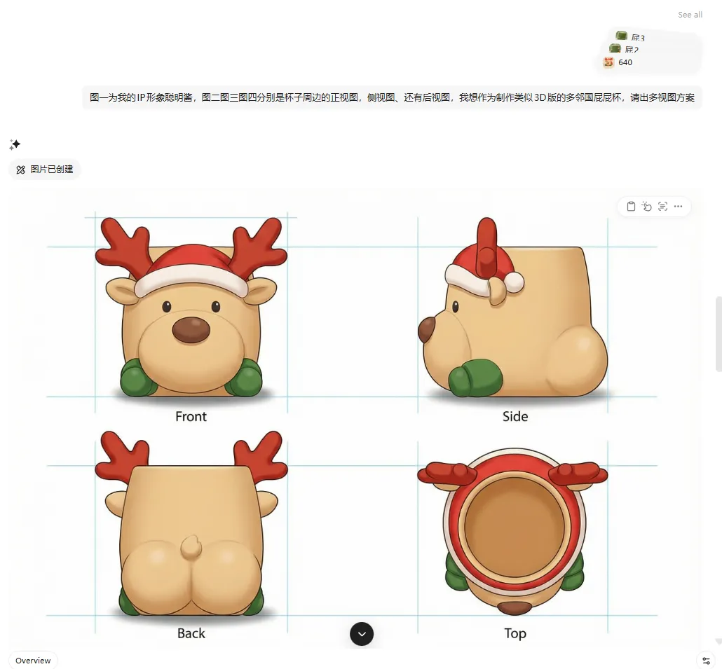 重要事情重复三遍:我不是卖课的!我不是卖课的!我不是卖课的!我这种懒人写完这篇推文已经燃尽了,这篇干货教程其实可以拆成3篇的,真的推荐大家自己多去试试新的AI产品,全文无广放心食用。之前关注了一些IP品牌方向的小红书商业化方向数据不错的博主,我深度研究他们会把自己的IP融入进产品设计里面。简单的说,IP形象就做成了生活类的创意产品,消费者为品牌产品设计的颜值和店铺服务买单。1解决了IP具象化的高昂成本与周期。以前要把一个IP形象做成创意产品,需要经历“草图-原画-三维建模-打样-工业制图”的长周期。每一个环节都需要专业人员,且改稿成本极高。2内容生产力与营销爆发力的错配。Veo 3.1、Sora 与 剪映一键成片 的组合,将视频产出从“周单位”压缩到了“分钟单位”。你能快速生成多版本、不同风格的视频进行 AB Test,筛选出流量转化率最高的素材。3审美一致性与品牌调性的维系的问题。通过在 Flowith 或 Youmind 中预设提示词(Prompt)和使用特定模型,你实际上是把 IP 的“审美灵魂”固化成了算法。无论产出多少图片,其核心调性是高度统一的。1工业级的一致性。很多 AI 设计只停留在“好看的图片”,无法变成真正的“产品”。通过 3D 文件的生成,你解决了产品在不同视角、不同场景下的一致性问题。这不仅是设计优势,更是供应链对接的优势。2视觉降维打击。即使是一个小工作室,也能通过这些昂贵的模型产出具有“大牌质感”的海报和视频。这种高颜值的视觉呈现,直接击中了小红书用户愿意为“颜值买单”的心理。3“策划-设计-宣发”极低的试错成本。你可以在产品还没量产前,先用AI生成的视频在小红书测款。根据读者的反馈(点赞、收藏、求购意向)再决定是否投入深度设计和后续大规模的生产。我发这篇文章的目的是提供一种别的可行性方向给大家参考,如果遇到同类型任务用传统工具在紧急很难实现的时候,可以试试这个我给你探索好的AI产品方向,可以拿着保存应急用。我的路径并不是最优但一定是最完整的,希望我的过程可以给你一个思考,我都是挑选了每个流程中相对最优的AI模型和AI工具去执行对应任务。我如何把想法变成现实?素材清单及产品展示视频展示下图是我在设计全案探索过程中产出一些素材清单可能看到这里你或许觉得那些流程好复杂,心里嘀咕我都可以用豆包直接解决,还不用钱呢。确实大部分执行者都是同样的想法,那么既然都是假,怎么样可以让用户少点厌恶觉得你是用心的,愿意看下去呢?用AI大家都会用,如何用得好AI才是拉开差距的关键,抓好关键环节才是自我深度思考的关键。接下来我会提到我在这个过程用到的AI产品,以及还有我的一些工具使用思考过程。在开始之前,给大家放松下看看我的抽象产品宣传视频吧,文案产出很偶然,每一个宣传文案都不在点上但我很喜欢。视频制作用到了视频flova智能体中主流视频模型Veo3.1和Sora2产出的素材,下图是两个视频模型的一些优势1、我下面教程中里面提到的AI产品lovart、Youmind和flowith都相对通用型的智能体,我在这里用到他们生图的香蕉PRO模型,目前香蕉Pro模型没有哪个产品免费额度很高的,因为它的API价格比较贵,产品烧钱供消费者试用比较困难,想要体验好花钱是要的。视频用到了视频flova智能体中主流视频模型Veo3.1和Sora产出的素材。2、产品高精度3D设计文件是用的影眸的 Hyper3D.AI产品,这是工业产品一致性的关键。3、剪映大家都比较熟悉,这次的话我将会用到它的一键成片的AI营销功能,他会给你文案选择、剪好的多条视频选择、提供了配好的声音和背景乐。对于工具选择上,我还是建议大家把手头AI工具盘点下,可以多选择一些聚合模型的平台,这样就不用来回换产品和适应新产品,学好提示词,学会选模型,有哪个工具用哪个工具。话说到此,那么我们正文开始吧杯子的设计灵感:来自朋友大聪明和橘子老师的给大聪明做的麋鹿趴趴的3D形象。造型参考的多邻国屁屁杯的形象,这个多邻国和瑞幸营销活动让我印象很深刻,当时7月份活动上线8小时这款屁屁杯周边单品就售罄了,目前12月中旬在闲鱼平台还有杯子二手持续的需求,最高的销量在400+。1、用香蕉PRO模型完成产品草图到产品实物图DEMO:产品草图设计、元素抠图、多视图细节微调2、影眸的 Hyper3D.AI上传产品多视图完成3D设计:3、用flova.ai上传三视图完成商品主图和视频素材积累4、剪映一键营销成片完成配好音频和剪辑合并素材5、用香蕉PRO上传商品主图+设计提示词完成商品详情页图设计1、用香蕉PRO模型完成产品草图到产品实物图DEMO产品草图设计: 上传IP图片和收集了我需要参考产品的三视图,多次抽卡抽到想要的产品草稿图元素抠图: 上传多视图到lovart 设计智能体,在画布中点击编辑元素,抠图多视图的中元素的视图多视图细节微调: 选中杯子多视图,再选中右下角思考模式执行设计任务,通过多次抽卡和进行细节微调,得到相对一致性的3个不同视角实物图2、影眸的 Hyper3D.AI上传产品多视图完成3D设计要是其他产品的步骤都是可以相互替代的,那么这个产品是最让我惊喜的。我只是用了一次就能做出比较惊艳的东西,他解决了我的初始实物三视图细节一致性的问题。大家可以认真看我上传的产品三视图,它很多细节不够完善。比如杯子的帽子位置在不同视图中高低不