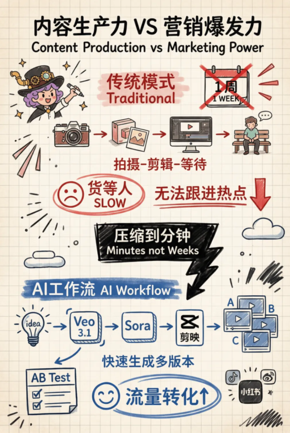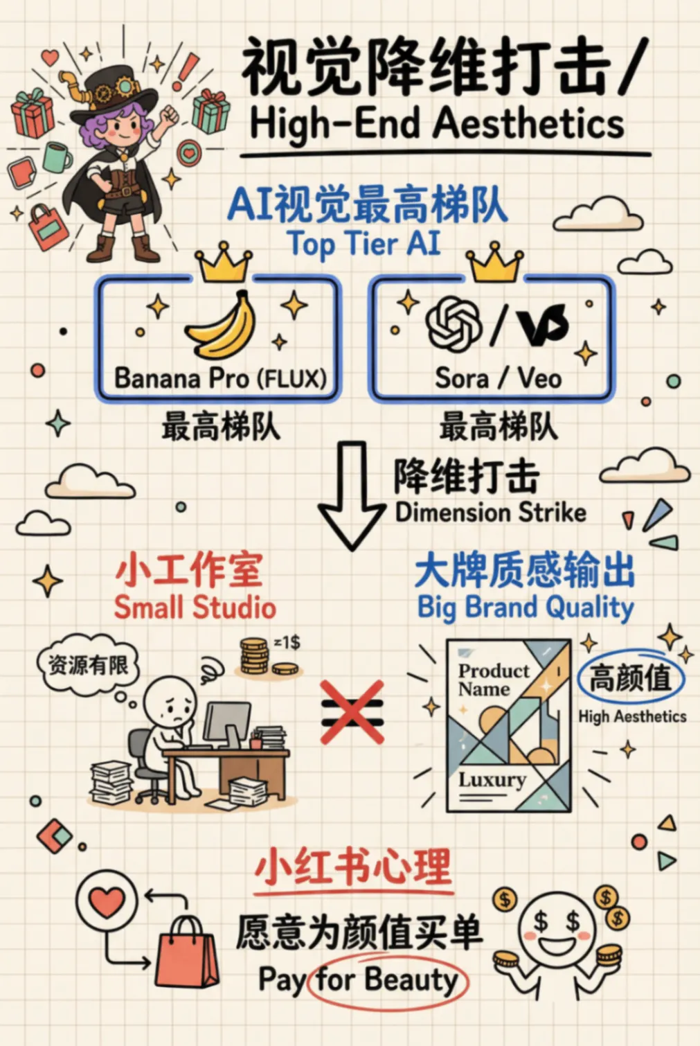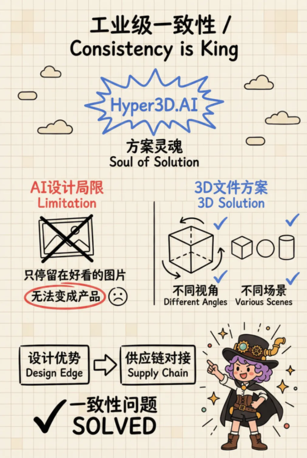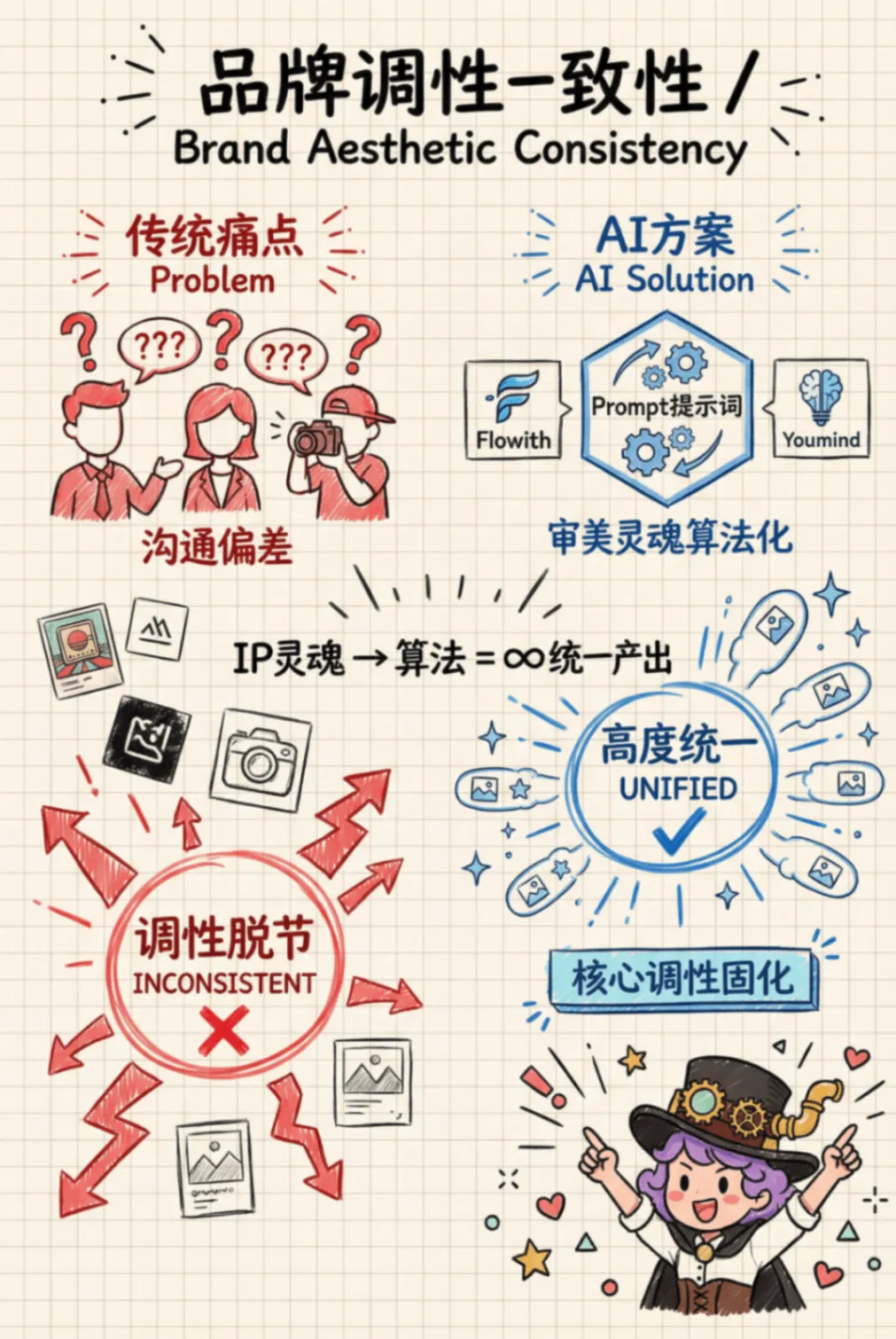 重要事情重复三遍:我不是卖课的!我不是卖课的!我不是卖课的!我这种懒人写完这篇推文已经燃尽了,这篇干货教程其实可以拆成3篇的,真的推荐大家自己多去试试新的AI产品,全文无广放心食用。之前关注了一些IP品牌方向的小红书商业化方向数据不错的博主,我深度研究他们会把自己的IP融入进产品设计里面。简单的说,IP形象就做成了生活类的创意产品,消费者为品牌产品设计的颜值和店铺服务买单。1解决了IP具象化的高昂成本与周期。以前要把一个IP形象做成创意产品,需要经历“草图-原画-三维建模-打样-工业制图”的长周期。每一个环节都需要专业人员,且改稿成本极高。2内容生产力与营销爆发力的错配。Veo 3.1、Sora 与 剪映一键成片 的组合,将视频产出从“周单位”压缩到了“分钟单位”。你能快速生成多版本、不同风格的视频进行 AB Test,筛选出流量转化率最高的素材。3审美一致性与品牌调性的维系的问题。通过在 Flowith 或 Youmind 中预设提示词(Prompt)和使用特定模型,你实际上是把 IP 的“审美灵魂”固化成了算法。无论产出多少图片,其核心调性是高度统一的。1工业级的一致性。很多 AI 设计只停留在“好看的图片”,无法变成真正的“产品”。通过 3D 文件的生成,你解决了产品在不同视角、不同场景下的一致性问题。这不仅是设计优势,更是供应链对接的优势。2视觉降维打击。即使是一个小工作室,也能通过这些昂贵的模型产出具有“大牌质感”的海报和视频。这种高颜值的视觉呈现,直接击中了小红书用户愿意为“颜值买单”的心理。3“策划-设计-宣发”极低的试错成本。你可以在产品还没量产前,先用AI生成的视频在小红书测款。根据读者的反馈(点赞、收藏、求购意向)再决定是否投入深度设计和后续大规模的生产。我发这篇文章的目的是提供一种别的可行性方向给大家参考,如果遇到同类型任务用传统工具在紧急很难实现的时候,可以试试这个我给你探索好的AI产品方向,可以拿着保存应急用。我的路径并不是最优但一定是最完整的,希望我的过程可以给你一个思考,我都是挑选了每个流程中相对最优的AI模型和AI工具去执行对应任务。我如何把想法变成现实?素材清单及产品展示视频展示下图是我在设计全案探索过程中产出一些素材清单可能看到这里你或许觉得那些流程好复杂,心里嘀咕我都可以用豆包直接解决,还不用钱呢。确实大部分执行者都是同样的想法,那么既然都是假,怎么样可以让用户少点厌恶觉得你是用心的,愿意看下去呢?用AI大家都会用,如何用得好AI才是拉开差距的关键,抓好关键环节才是自我深度思考的关键。接下来我会提到我在这个过程用到的AI产品,以及还有我的一些工具使用思考过程。在开始之前,给大家放松下看看我的抽象产品宣传视频吧,文案产出很偶然,每一个宣传文案都不在点上但我很喜欢。视频制作用到了视频flova智能体中主流视频模型Veo3.1和Sora2产出的素材,下图是两个视频模型的一些优势1、我下面教程中里面提到的AI产品lovart、Youmind和flowith都相对通用型的智能体,我在这里用到他们生图的香蕉PRO模型,目前香蕉Pro模型没有哪个产品免费额度很高的,因为它的API价格比较贵,产品烧钱供消费者试用比较困难,想要体验好花钱是要的。视频用到了视频flova智能体中主流视频模型Veo3.1和Sora产出的素材。2、产品高精度3D设计文件是用的影眸的 Hyper3D.AI产品,这是工业产品一致性的关键。3、剪映大家都比较熟悉,这次的话我将会用到它的一键成片的AI营销功能,他会给你文案选择、剪好的多条视频选择、提供了配好的声音和背景乐。对于工具选择上,我还是建议大家把手头AI工具盘点下,可以多选择一些聚合模型的平台,这样就不用来回换产品和适应新产品,学好提示词,学会选模型,有哪个工具用哪个工具。话说到此,那么我们正文开始吧杯子的设计灵感:来自朋友大聪明和橘子老师的给大聪明做的麋鹿趴趴的3D形象。造型参考的多邻国屁屁杯的形象,这个多邻国和瑞幸营销活动让我印象很深刻,当时7月份活动上线8小时这款屁屁杯周边单品就售罄了,目前12月中旬在闲鱼平台还有杯子二手持续的需求,最高的销量在400+。1、用香蕉PRO模型完成产品草图到产品实物图DEMO:产品草图设计、元素抠图、多视图细节微调2、影眸的 Hyper3D.AI上传产品多视图完成3D设计:3、用flova.ai上传三视图完成商品主图和视频素材积累4、剪映一键营销成片完成配好音频和剪辑合并素材5、用香蕉PRO上传商品主图+设计提示词完成商品详情页图设计1、用香蕉PRO模型完成产品草图到产品实物图DEMO产品草图设计: 上传IP图片和收集了我需要参考产品的三视图,多次抽卡抽到想要的产品草稿图元素抠图: 上传多视图到lovart 设计智能体,在画布中点击编辑元素,抠图多视图的中元素的视图多视图细节微调: 选中杯子多视图,再选中右下角思考模式执行设计任务,通过多次抽卡和进行细节微调,得到相对一致性的3个不同视角实物图2、影眸的 Hyper3D.AI上传产品多视图完成3D设计要是其他产品的步骤都是可以相互替代的,那么这个产品是最让我惊喜的。我只是用了一次就能做出比较惊艳的东西,他解决了我的初始实物三视图细节一致性的问题。大家可以认真看我上传的产品三视图,它很多细节不够完善。比如杯子的帽子位置在不同视图中高低不