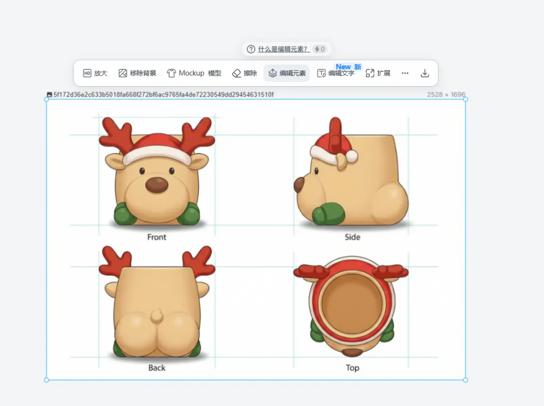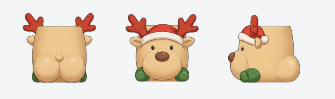 - 正视图:展示奶黄色大脸、棕色圆鼻子、黑色小眼睛、红色圣诞帽和鹿角、底部立体绿色小爪子