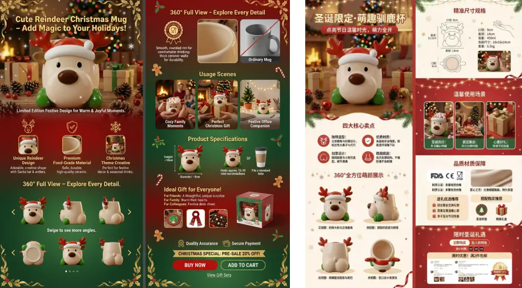 - 标注包装尺寸及重量信息5. 使用场景区(3个场景,每个场景配高质量情境图): - 圣诞饮品场景:展示盛装热可可、蛋奶酒等节日饮品的温馨画面