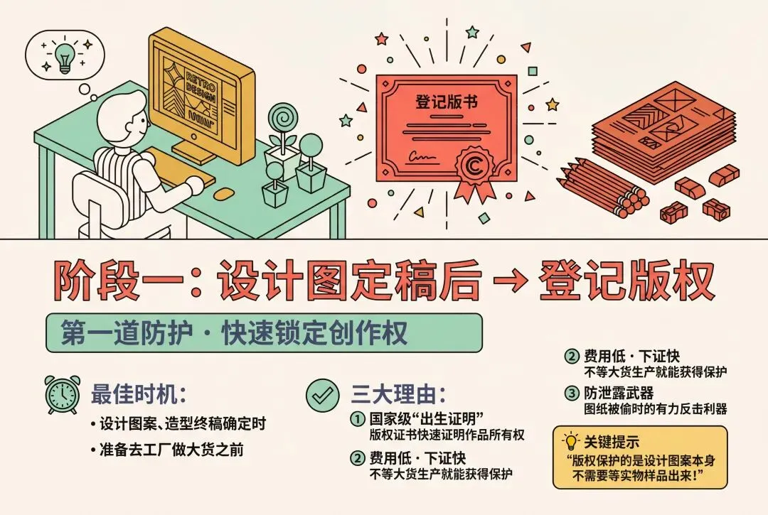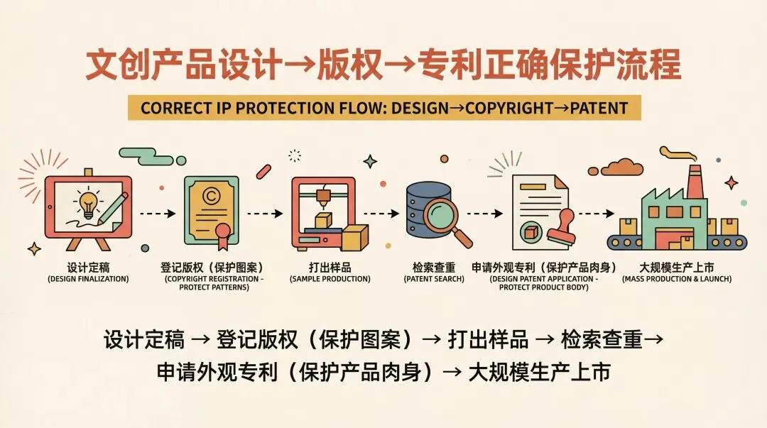 这里我做了英文版和中文版的两组商品详情图,这样的产品详情图后续可以在全球主流电商平台做上架,商品详情页的语言需求可以在加在提示词前缀上。(可以为产品出口到各大国家,提前做好准备)经过具体调查对于IP文创产品的设计到实际产品上线会经过一个样品打样阶段,如果有和我都是新手的,可以提前了解下一些具体的步骤,这样你会对文创产品生产的全流程有个大致的了解,希望对大家有帮助。给各位股东汇报下,聪明屁屁杯目前已经登记了版权,后续会进入一个相对漫长的样品打样期时机: 当你的设计图案、造型终稿在电脑上确定下来,准备去工厂做大货之前。版权登记证书是国家给你的“出生证明”,能直接、快速地证明这个作品在某个时间点已经属于你了。时机: 拿到实物样品,准备大规模开模投入生产之前。评估落地性: 先看样品能不能还原你的设计,如果实物根本做不出来,或者效果很差,申请专利的钱就白花了。进行专利检索: 在开模这个烧钱的环节之前,可以找个专业机构或代理人,帮你做个简单的专利检索。以上就是本期的内容,这个内容我整整打磨了一周,所有的信息都是我提前收集信息,查资料自己实践做出来的,可能会有小细节不够完美,但是这已经是我目前水平能做到的最好的推文了。感谢各位粉丝看到最后,你们学习辛苦了!我在此宣誓:我一定会好好工作打工挣钱,争取给粉丝们送设计周边大礼包!明年我将用空余时间去景德镇进修杯子烧制手艺,亲自为努力学习的粉丝颁奖。今年做的各种叠叠鸭,金鱼神还有聪明酱的IP周边都会整理成箱子周边大礼包,应抽尽抽应送尽送给我的粉丝们(感谢我那100多个粉丝不离不弃),对了还没关注我的记得关注我,到时候别错过了抽大奖!这可是明年头等大事呢!最后我是AI产品设计师箱子,带你发现优秀的AI产品!