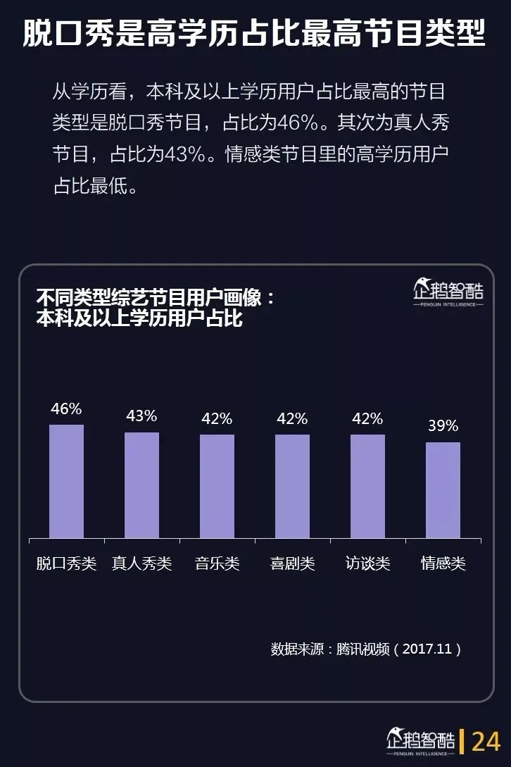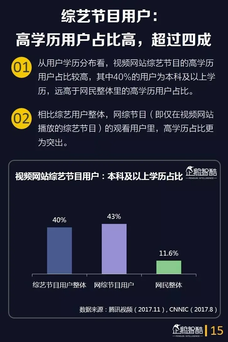 网综节目用户中,高学历用户占比超过了40%。这部分用户对综艺节目在模式探索上提供了更大的边界。