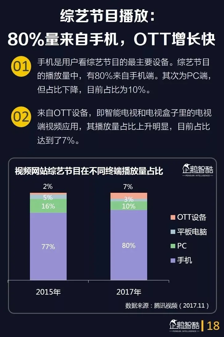 综艺节目在视频网站的播放量中,已经有80%来自手机。节目播放场景移动化趋势明显。