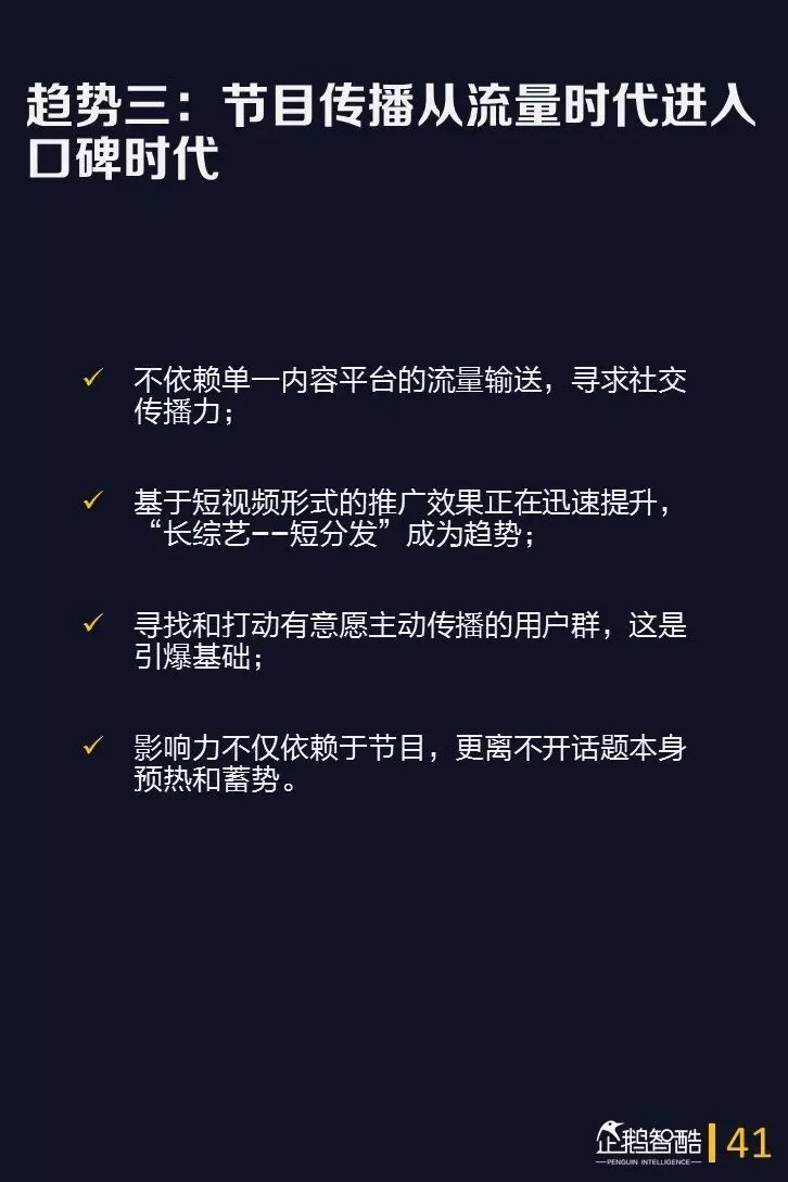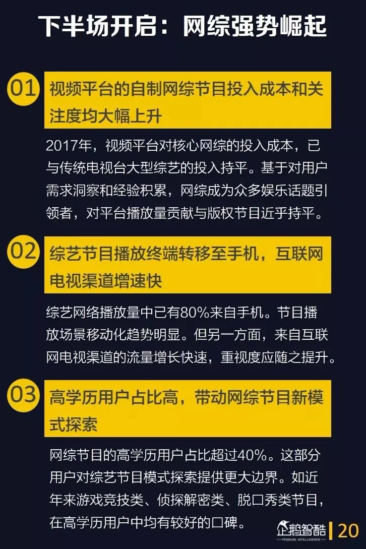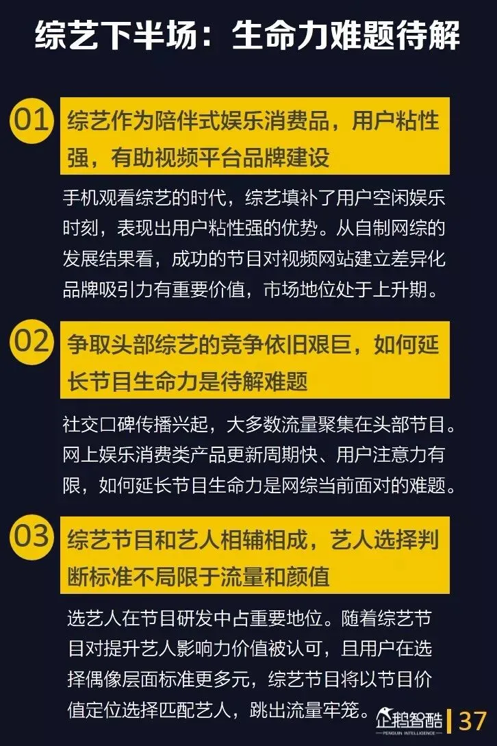 当综艺节目进入网络时代,众多变化随之发生。企鹅智酷将其概括为“中国综艺的下半场之变”。