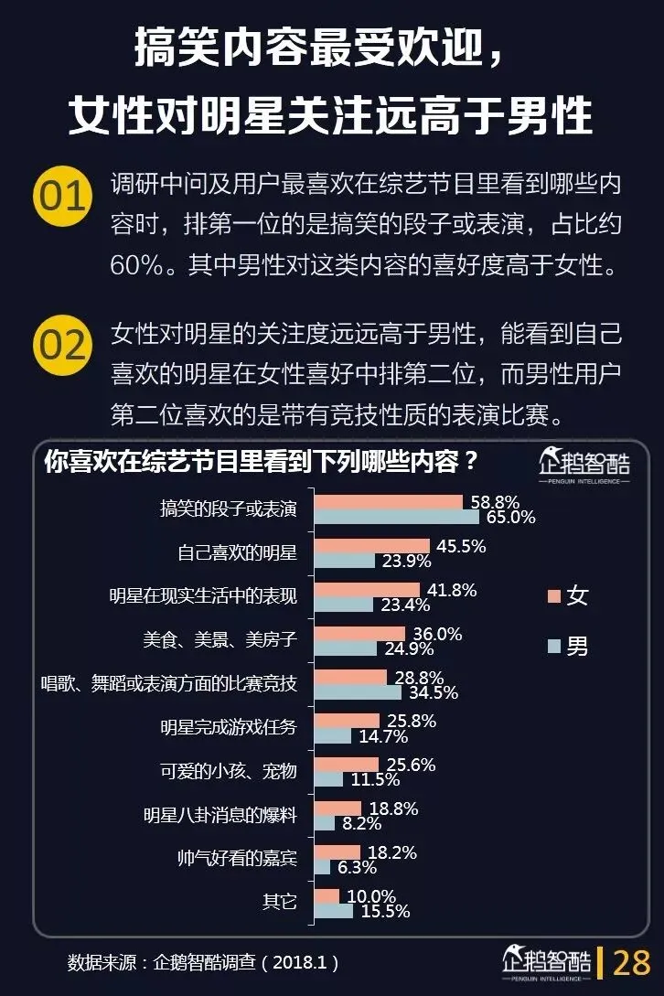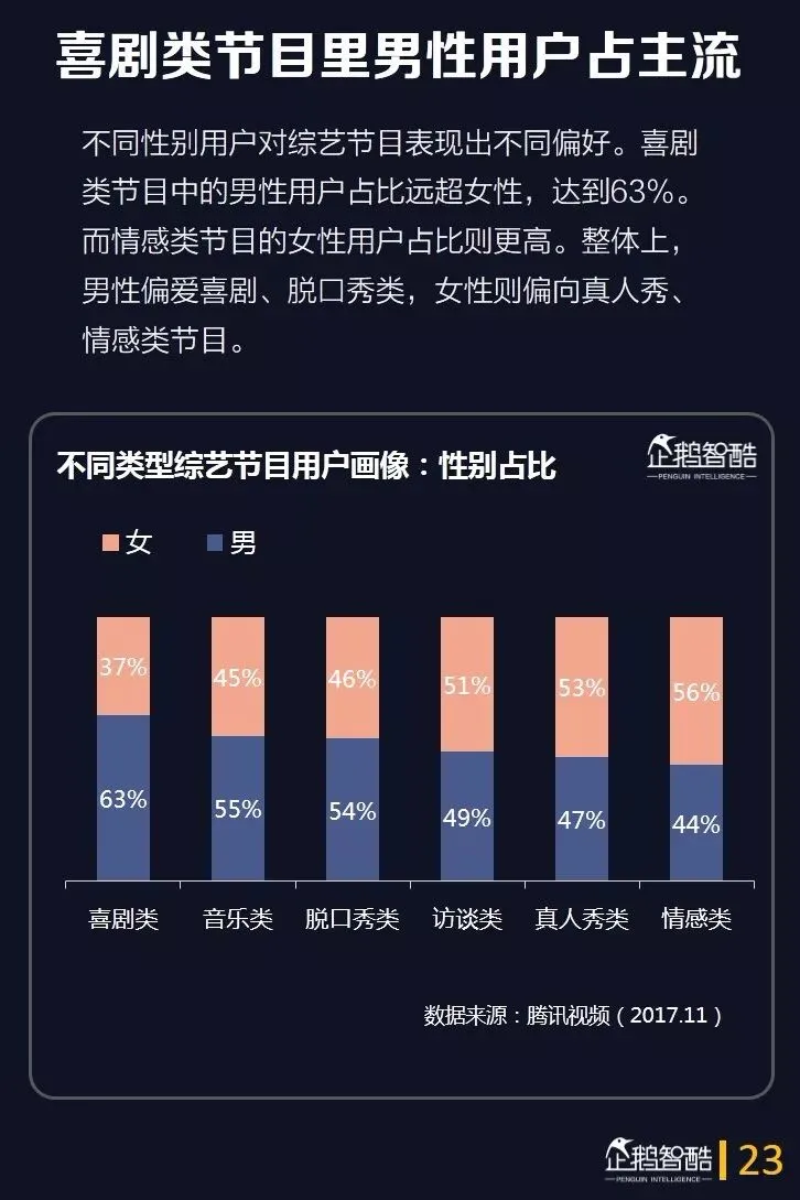 男性在喜剧类节目中的占比远远高于女性。而女性在明星真人秀、情感类节目中占比更高。