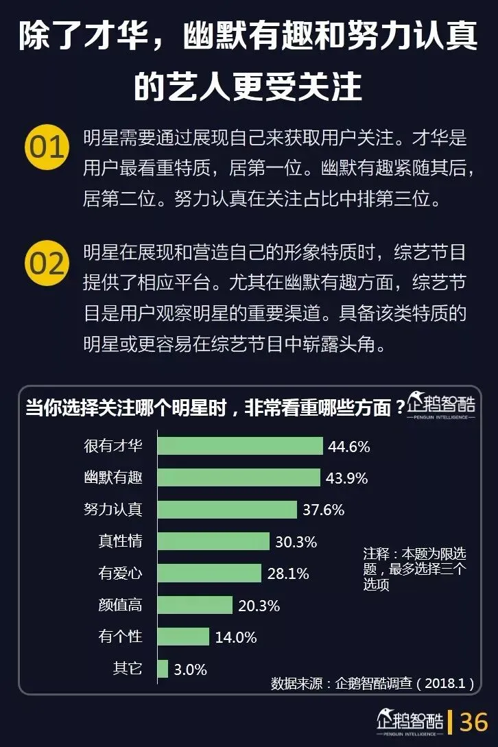 随着综艺节目对提升艺人影响力的价值被认可,用户在选择偶像层面标准更多元,综艺节目将以节目价值定位选择匹配艺人,跳出流量牢笼。
