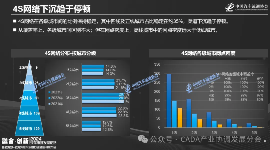 2023年,4S网络在各级城市的分布保持稳定。《报告》中提及,四线及五线城市占比约35%,渠道下沉步伐暂缓。虽然各级城市间覆盖率相近,但高线城市网点密度显著高于低线城市。单一品牌网络过于密集,导致单店销量下降,品牌内部竞争加剧,影响利润。与燃油车品牌类似,新能源网络在高线城市中也面临密度大与销量低的矛盾。