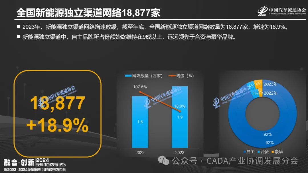 2023年,新能源独立渠道网络数量达18,877家,增速18.9%。自主品牌占据绝对优势,份额超九成。在新能源独立渠道业态上,销售功能的展厅/体验中心占近半数,传统的4S店形态不再是主流。