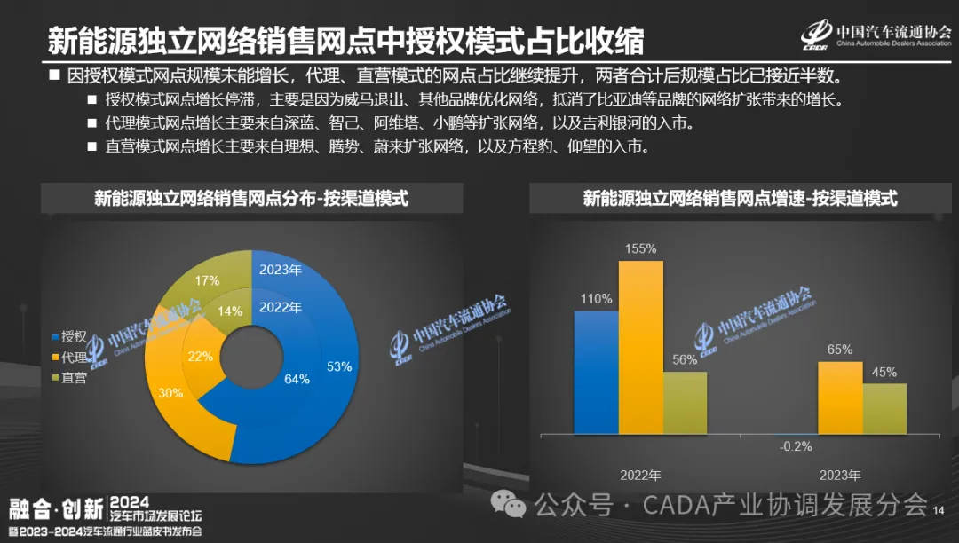 郎学红在报告解读中提到,新能源独立网络授权模式网点增长受限。《报告》显示,代理、直营模式占比持续提升,两者合计后规模占比已接近半数。威马退出及品牌网络优化导致授权模式网点增长停滞,抵消了比亚迪等品牌的网络扩张带来的增长。代理模式网点增长得益于深蓝、智己、阿维塔、小鹏等品牌扩张及吉利银河新入市。直营模式网点增长则归功于理想、腾势、蔚来等品牌网络扩张及新品牌方程豹、仰望入市。