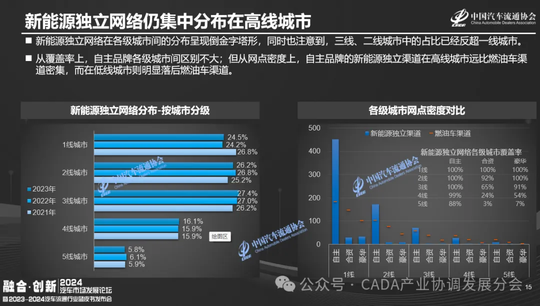 郎学红提到,新能源独立网络在各级城市间分布呈倒金字塔形,二、三线城市占比已超越一线城市。覆盖率方面,自主品牌各级城市相近;但网点密度上,自主品牌的新能源独立渠道在高线城市较燃油车更密集,低线城市则相反。