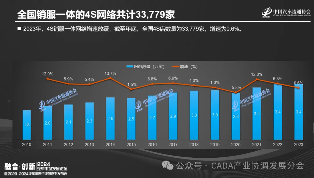 《报告》显示,2023年全国4S店数量为33,779家,同比增长0.6%,网络增速明显放缓。