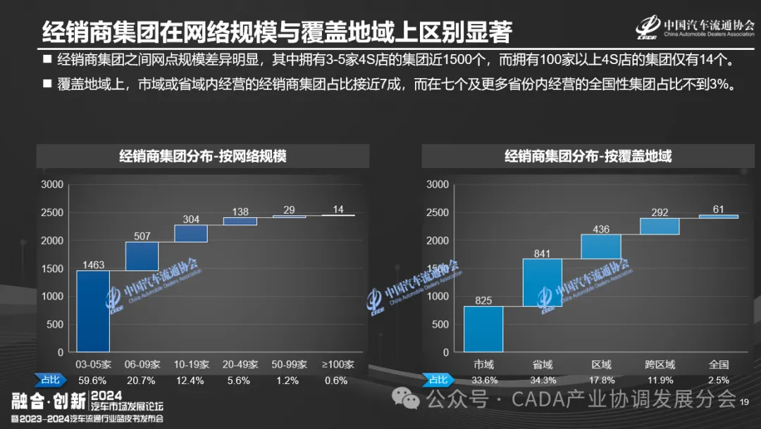 谈到网点规模,郎学红表示经销商集团间网点规模差异显著。其中拥有3-5家4S店的集团近1500个,而拥有百家以上4S店的集团仅14个。地域覆盖上,市域或省域内经营的集团占比近七成,在七个及更多省份内经营的全国性集团则不足3%。这些数据揭示了4S网络发展的多元化与不均衡性。