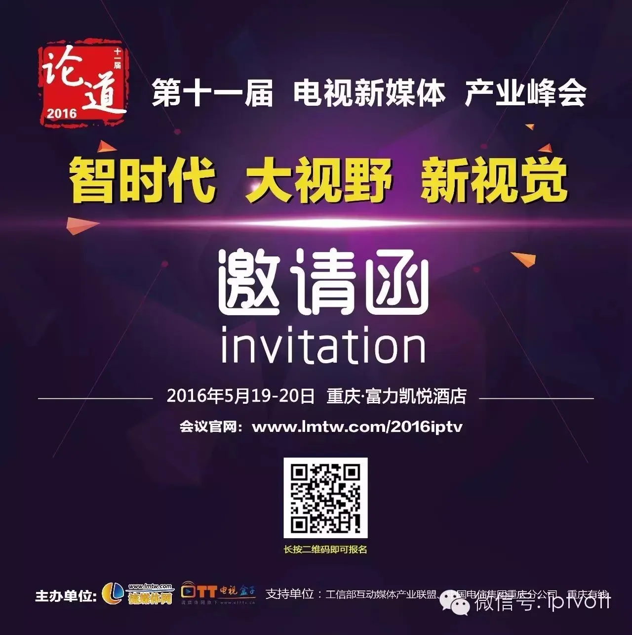 2016年5月19-20日,流媒体网将在重庆召开以“智时代、大视野、新视觉”为主题的第十一届行业论道高峰论坛,邀请产业各方,共同探索IPTV/OTT的未来。为产业各方寻求融合机遇,重构产业的创新成长而打造一个真正融合的电视产业链行业大会。