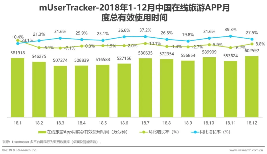 和PC端的走势相反,在线旅游APP月度总有效使用时间在2018年复合增长率达到27%,移动端生活方式高度普及,用户粘性更高;从环比来看,在冬夏两季用户使用时间显著增加。