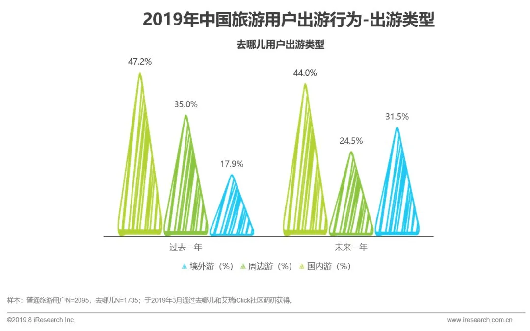 2019年中国旅游用户境外游增长意愿明显(增长率达63%)。用户出游类型多元化,家庭游是主力,未来休闲度假和深度文化游比例升高。