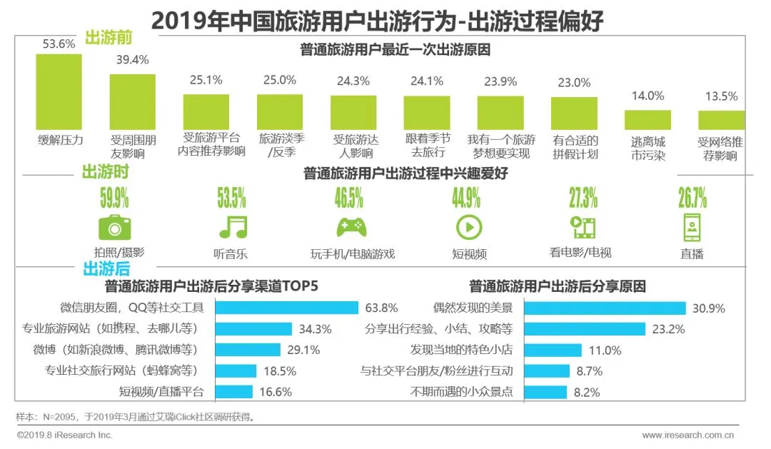 53.6%的普通用户出游是为了放松解压,亲朋推荐(39.4%)、旅游平台推荐(25.1%)也是影响出游的重要原因;旅途中用户喜欢听音乐/玩游戏放松身心;86.1%的用户喜欢游后分享,尤其爱在社交平台和专业旅游网站分享风景和攻略。