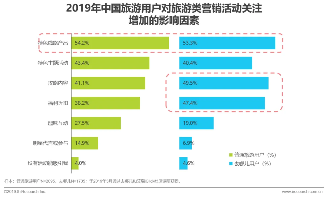 调研数据显示,50%以上的用户认为特色的线路产品能吸引对他们旅游营销活动的关注,去哪儿用户认为攻略内容及福利折扣能增加自身关注。