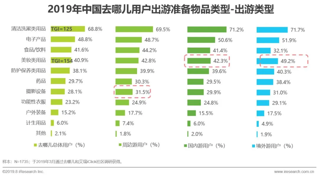 调研数据显示,去哪儿用户在准备清洁洗漱类用品(TGI=125)和美妆类用品(TGI=154)的比例高于普通旅游用户,尤其是去哪儿国内游和境外游用户对于美妆类产品的需求更高。