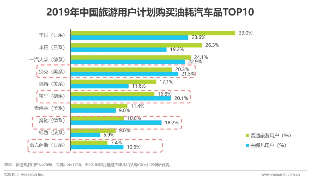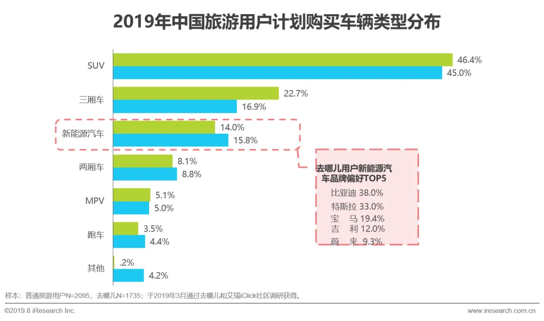 游用户购车首选SUV,大空间更适合家庭出游;去哪儿用户选购新能源车的比例(15.8%)高于普通用户,偏爱比亚迪、特斯拉、宝马等中高端车型;在选购油耗车时,去哪儿用户比普通用户更爱高档车,如宝马、奔驰等品牌。