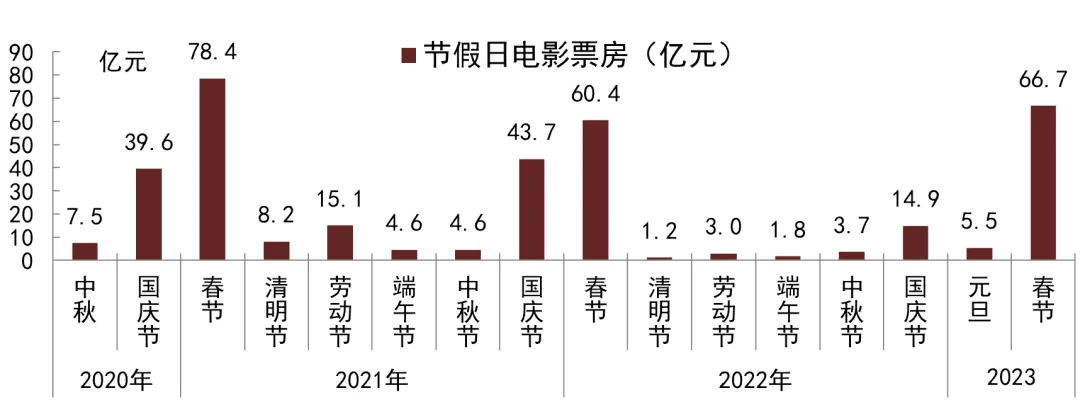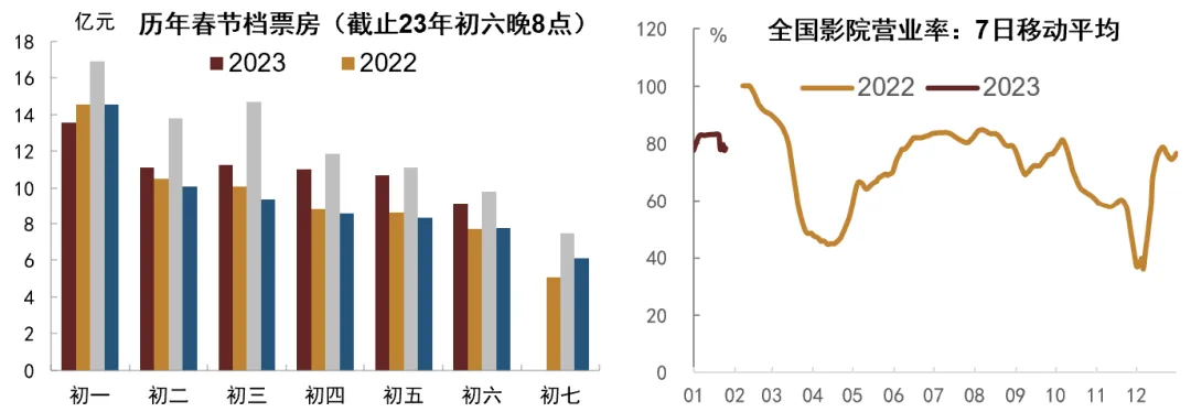 (5)烟花爆竹和贺岁档电影是消费亮点。烟花爆竹是因为不少城市放松了管制,允许一定范围一定程度燃放烟花爆竹,增加节日气氛。这个确实在一定程度上拉动了消费和节日气氛。另一个是电影。由于疫情高峰过去,电影院这种密闭空间的服务业消费也恢复很快。尤其是今年春节有两部口碑不错的贺岁档电影《满江红》和《流浪地球2》,吸引了不少观众到电影院观看。2023年的电影口碑比2022年的好,这个也是电影票房增长的重要因素。但从电影票价来看,也有一定涨价情况,一线城市核心地段电影院,电影票价动辄上百元,也是票房增加的重要因素。相比之下,很多四五线城市以及小小县城,电影票价小几十元。回乡消费的性价比高不少。