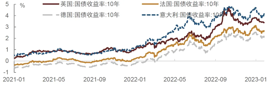 【欧债收益率整体震荡上行】1月20日至1月24日,英国10年期国债收益率累计下行5bp,法国10年期国债收益率累计下行2bp,德国10年期国债收益率累计上行4bp;意大利10年期国债收益率累计下行5bp。1月24日至1月26日,法国10年期国债收益率累计上行7bp至2.662%;德国10年期国债收益率累计上行1bp至2.170%;意大利10年期国债收益率累计上行24bp至4.163%。
