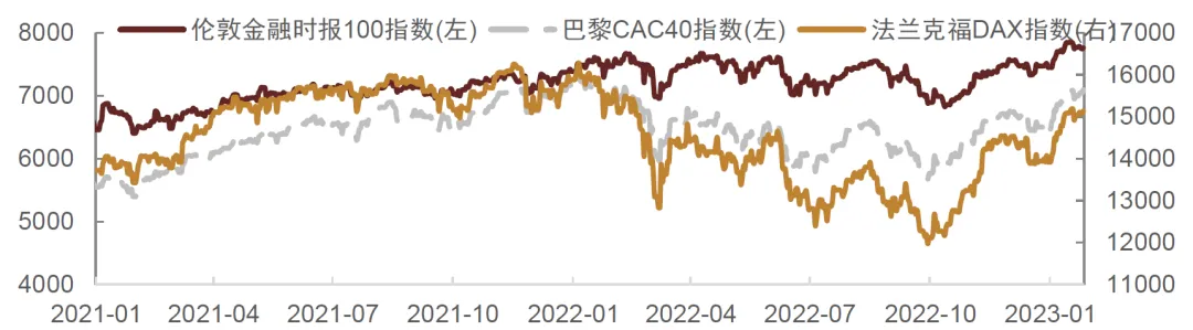 从欧洲这边来看,情况也是类似的。此前欧洲央行由于担心欧洲经济受到能源冲击和通胀冲击,陷入衰退的风险比较大,因此加息和流动性收缩显得有点保守。那么在欧洲出现暖冬,能源冲击已经缓解之后,其实欧洲整体经济并没有预期那么差。从欧洲1月份的PMI数据来看,可以看到明显的反弹迹象。春节期间,德国政府发布年度经济报告,将2023年GDP增长预期由萎缩0.4%上调至增长0.2%,德国经济部长表示,该国经济可能出现技术性衰退,但将免于急剧下滑。正因为对经济衰退风险的担忧下降,欧洲央行内部有越来越强烈的声音认为2月份和3月份的议息会议需要各加息50bp,来进一步抑制通胀。而且欧元央行可能从一季度开始考虑进行缩表。这意味着欧洲的流动性紧缩将后程发力。毕竟从目前欧元区的M2下降幅度和速度来看,是明显滞后于美国的。