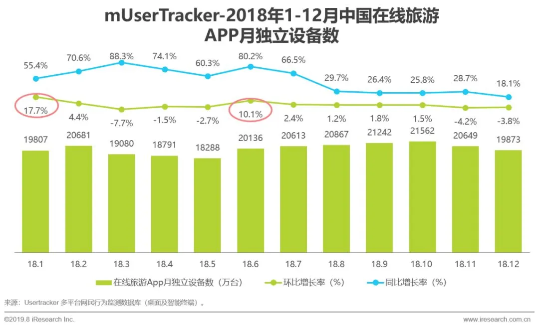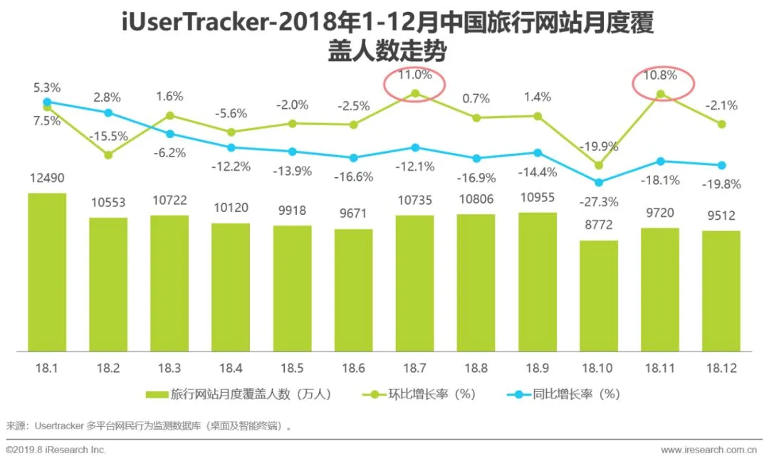 艾瑞iUserTracker数据显示,相比2017年,从2018年3月开始PC端用户流量全面下滑;从环比来看,用户出行在7月和11月出现流量小高峰,暑期和年末出游量增加。