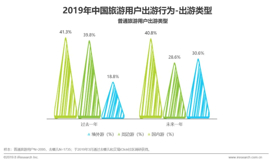 2019年中国旅游用户境外游增长意愿明显(增长率达63%)。用户出游类型多元化,家庭游是主力,未来休闲度假和深度文化游比例升高。