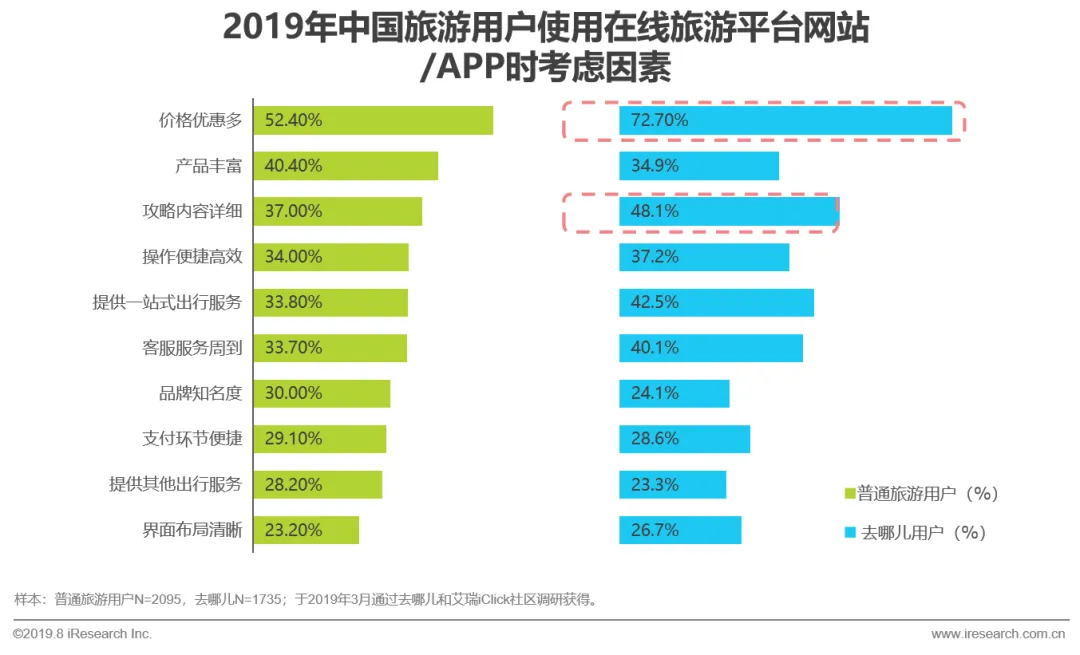 调研数据显示,用户在选择在线旅游平台时最看重价格优惠和产品资源的丰富程度;去哪儿用户更看重价格优惠和详细的攻略内容。