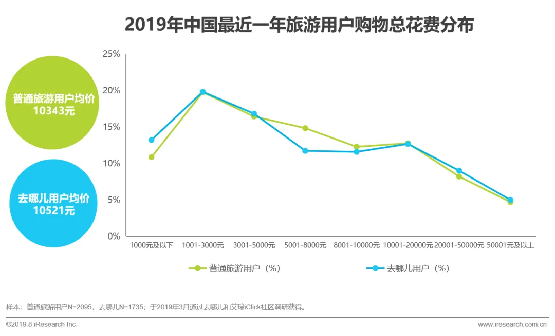 调研数据显示,普通旅游用户和去哪儿用户购物均价超过1万元,去哪儿用户消费金额高于普通用户,从区间分布来看,去哪儿高消费用户(20000元以上)人数更多。