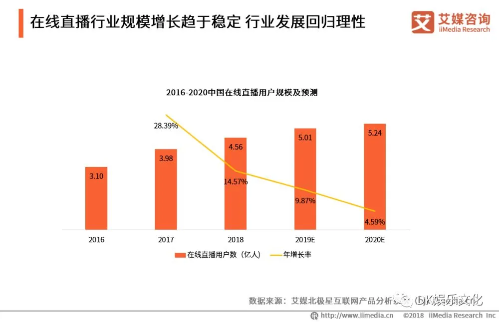 iiMedia Research(艾媒咨询)数据显示2018年中国在线直播用户规模达4.56亿人,增长率为14.6%,预计2019年在线直播用户规模达到5.01亿人,增长速度放缓。艾媒咨询分析师认为,行业降温,在线直播市场发展回归理性,对平台的内容生产、主播培育和吸流能力提出了更高要求。