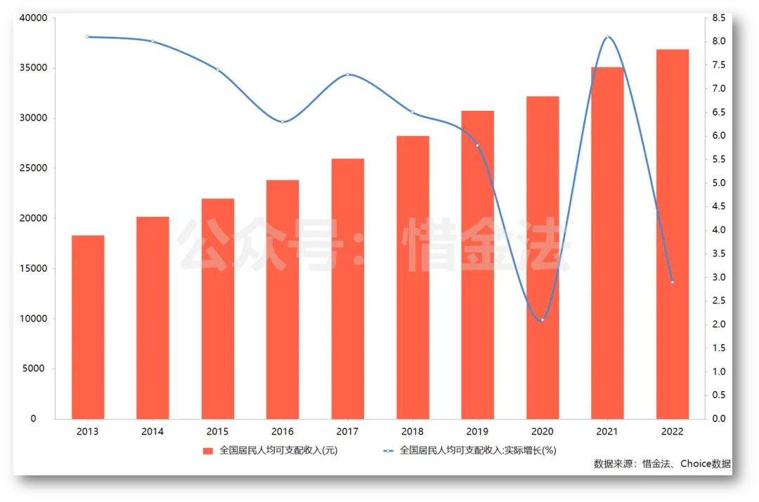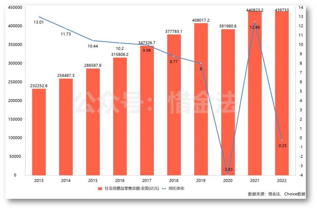 昨日早晨,国家统计局发布《2022年国民经济和社会发展统计公报》,数据涵盖国内生产总值GDP、人口、就业、外汇、城镇化率等。数据比较多,君郁就不一一复制,挑几个重要的和大家说下:去年网友担心“消费降级”,本次发布人均可支配收入同比增速放缓,可以感受到去年经济增长压力和2020年差不多。不过,依然是保持5%增长(扣除价格因素实际2.9%),大家手里的钱还是比之前充裕。可能存在舍不得花的情况,但应该没达到口袋钱变少而降级的程度。按消费类型统计,商品零售额增长0.5%,餐饮收入额下降6.3%。(可见疫情对整个餐饮产业链影响之大。)全年限额以上单位商品零售额中,粮油、食品类零售额比上年增长8.7%,饮料类增长5.3%,烟酒类增长2.3%,服装、鞋帽、针纺织品类下降6.5%,化妆品类下降4.5%,金银珠宝类下降1.1%,日用品类下降0.7%,家用电器和音像器材类下降3.9%,中西药品类增长12.4%,文化办公用品类增长4.4%,家具类下降7.5%,通讯器材类下降3.4%,石油及制品类增长9.7%,汽车类增长0.7%,建筑及装潢材料类下降6.2%。常有同学说不知道怎么选能长期上涨的“好行业”,教你们一个技巧,从零售额升降数据,就可以选出“下游零售行业”的长牛赛道。如2022年数据,消费增长中,食品饮料增长依然是很稳健的;中西药高增长受益于疫情和流感盛行;文化办公用品增长倒是意想不到,原本以为“双减”政策影响下数据会减弱,实际并非如此。