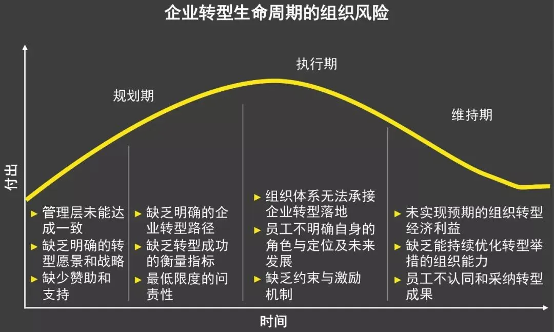 企业转型在不同的阶段会面临不同的组织风险,如果缺乏有效的应对措施,企业转型将会面临巨大挑战。缺乏明确的转型愿景和战略、管理层未能达成一致、缺少有效的赞助和支持,以及进一步缺乏明确的企业转型路径、转型成功的衡量指标和最低限度的问责是在企业转型初期需要及时应对和有效解决的组织风险。在企业转型执行期,要确保组织体系和员工自身能有效承接企业转型目标,帮助企业转型落地。在企业转型维持期,如何让全体利益相关者接纳转型成果和培养持续的变革转型能力需要尤为关注。
