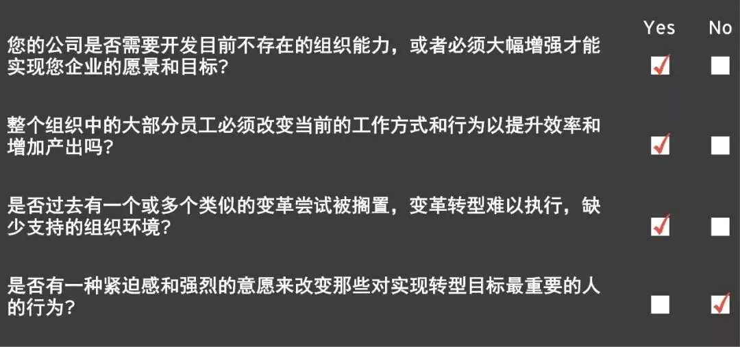 以下几个关键问题可以帮助您确认您的企业对组织变革管理的需求。如果答案看起来如下图(图二),您的企业就得采取实际行动,而不能寄希望于通过不断地口头“声明”或“强调”去实现企业成功转型目标。