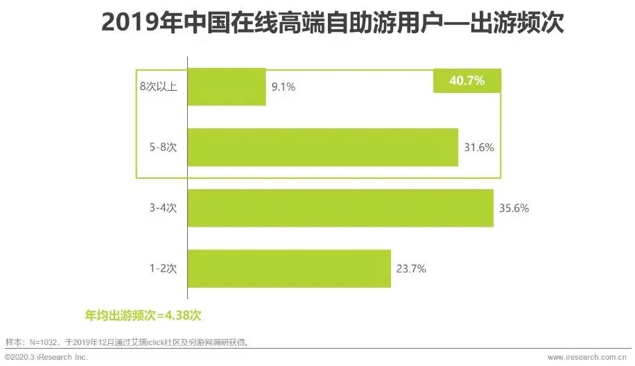 调研数据显示,40.7%的中国在线高端自助游用户一年出游频次在5次以上,年均出游4.38次。