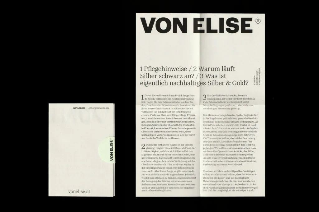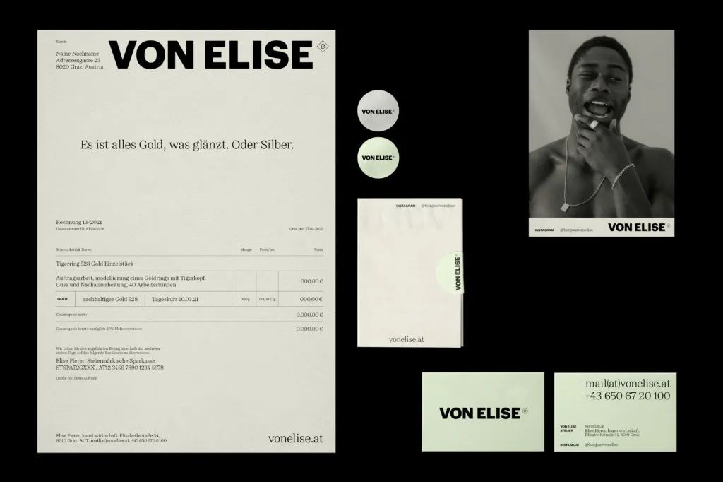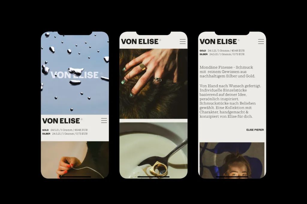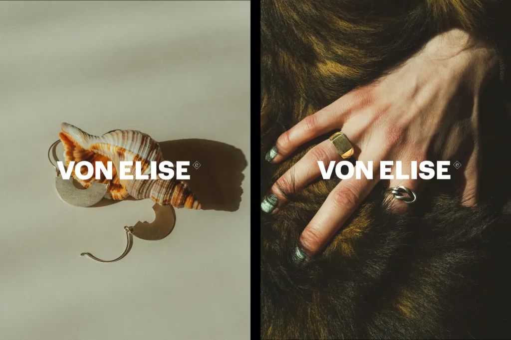 The identity’s everyday adornment character was amplified with the timeless Serif-Font to reflect the durability of metal as well as the reliability of craftspeople. The logo is the hallmark Von Elise imprints into all jewellery to prove the item’s authenticity and recognition it was made by a goldsmith.
