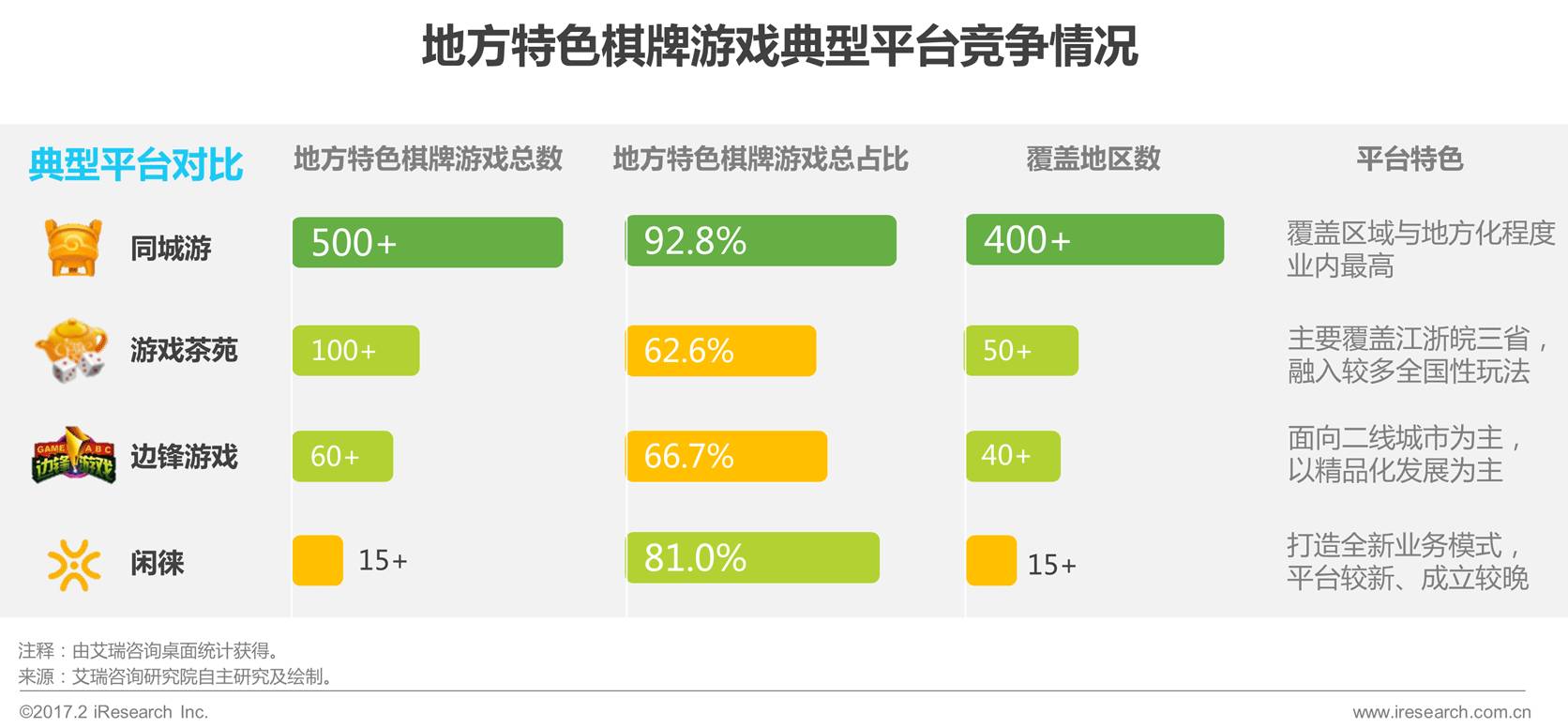 我们选取了四家目前市场热度较高的地方特色棋牌游戏平台做平台数据对比,不难看出目前地方特色棋牌游戏平台差异化发展趋势十分明显。大平台更注重平台的覆盖区域与地方化程度,而小平台则相对更注重精品化的发展并不断寻求差异化发展方向。