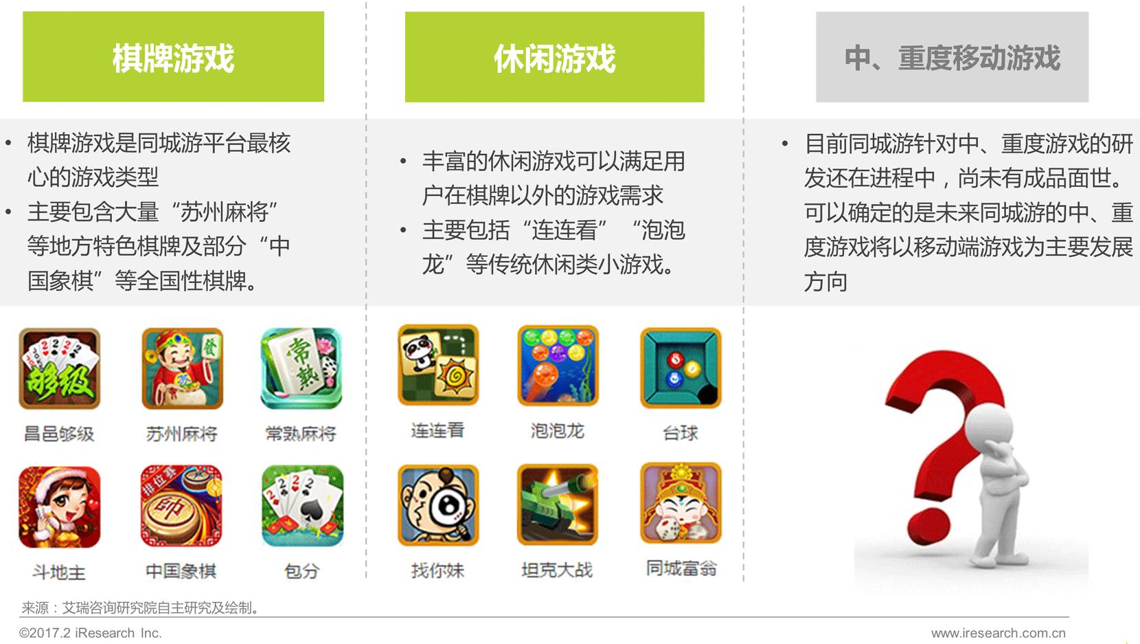 经过十多年的发展,当网络游戏已逐渐进入视频直播时代,棋牌游戏的社交互动功能却仍然停留在文字交流的初级阶段。因此,地方特色棋牌游戏平台未来加强社交化的发展趋势是可以预见的。